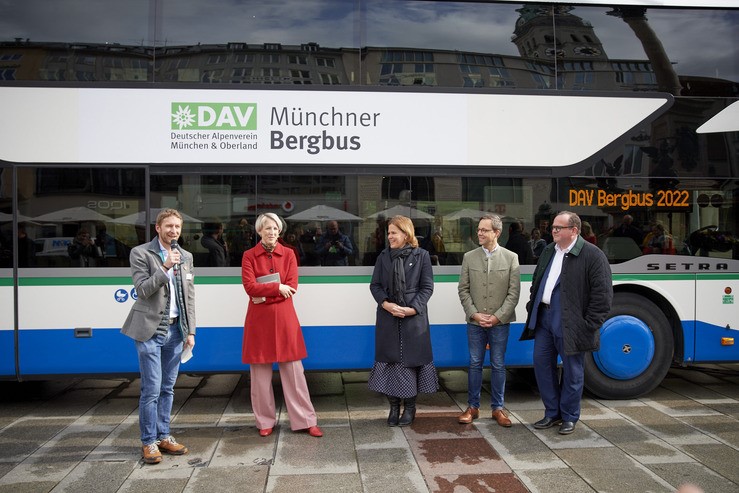 Der Münchner Bergbus fährt auch 2022 wieder: Die Pressekonferenz des Mobilitätsprojekts des Alpenvereins München & Oberland markiert den Startschuss in die zweite Saison nach einer gelungenen Pilotphase im vergangenen Jahr. Bei der Pressekonferenz auf dem Münchner Marienplatz wurden neben einer neuen Linie alle Neuerungen für die Saison 2022 vorgestellt.