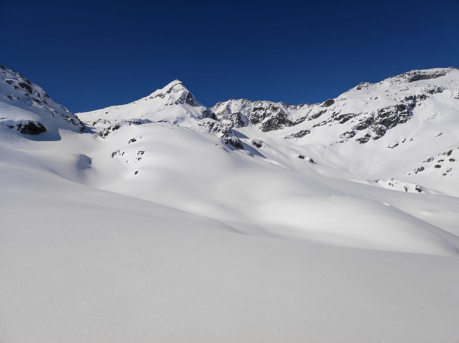 Ab dem Hotel dann im Aufstieg sehr zäh, da der Schnee bedingt durch die Sonneneinstrahlung übelst gestollt hat. Also unterm Ski und auf dem Ski auch. Gefühlt 5kg bei jedem Schritt... Fellwachs hat auch nicht geholfen. Einen Großteil musste ich spuren (30cm Neuschnee), bis mich ein schnellerer Geher mit seinen Spaghetti-Skiern überholt hat. Seine Spurarbeit hat mir aber nicht viel geholfen, weil seine Spur (64er Ski, glaub ich) viel zu schmal für mich war.