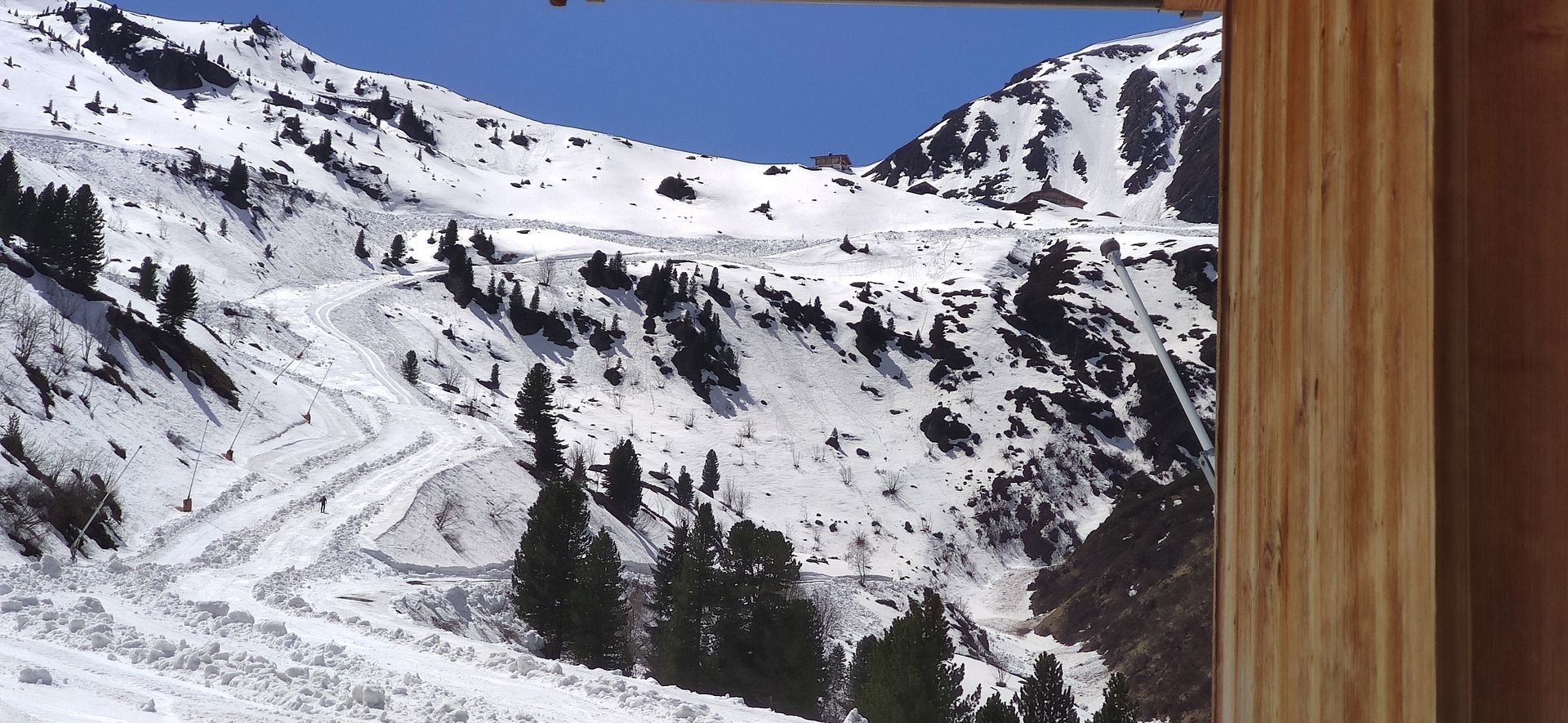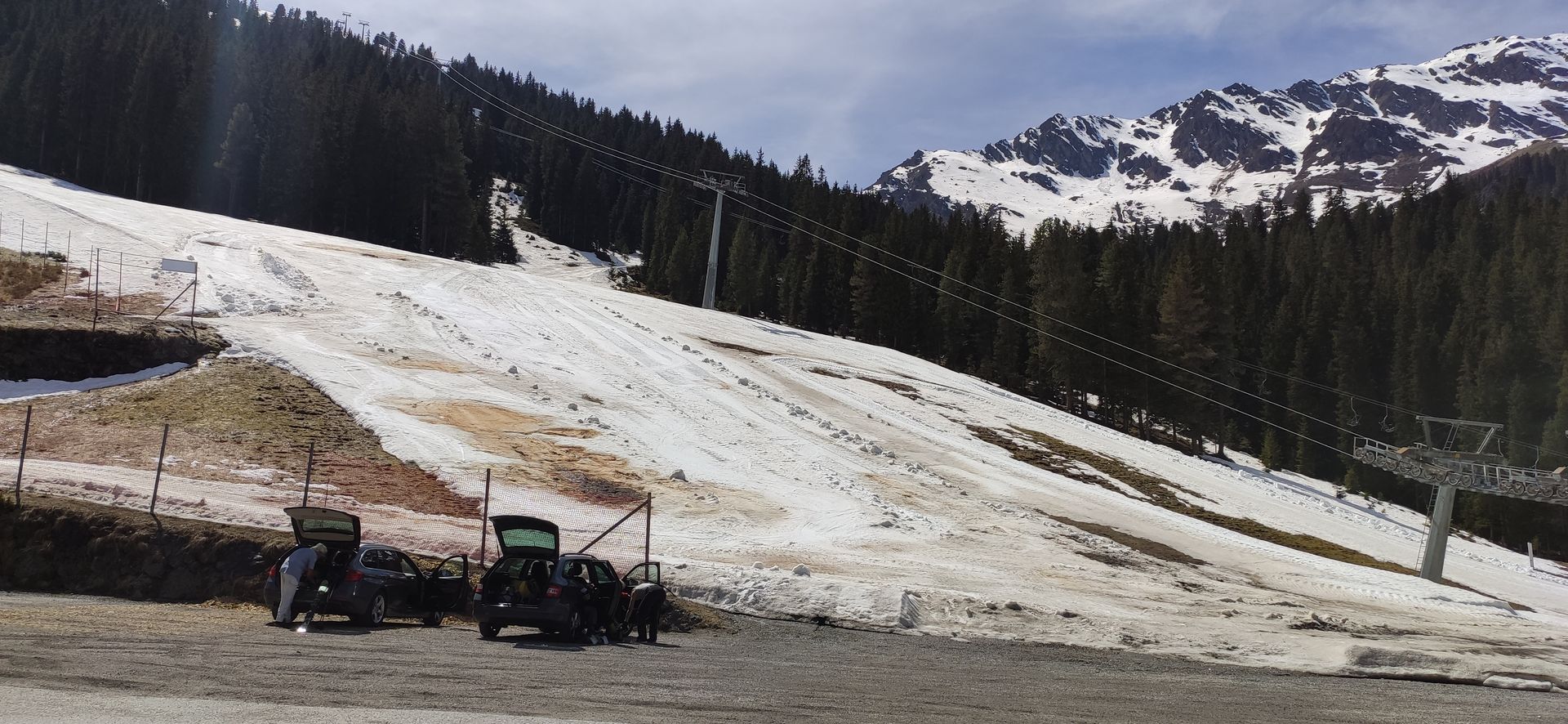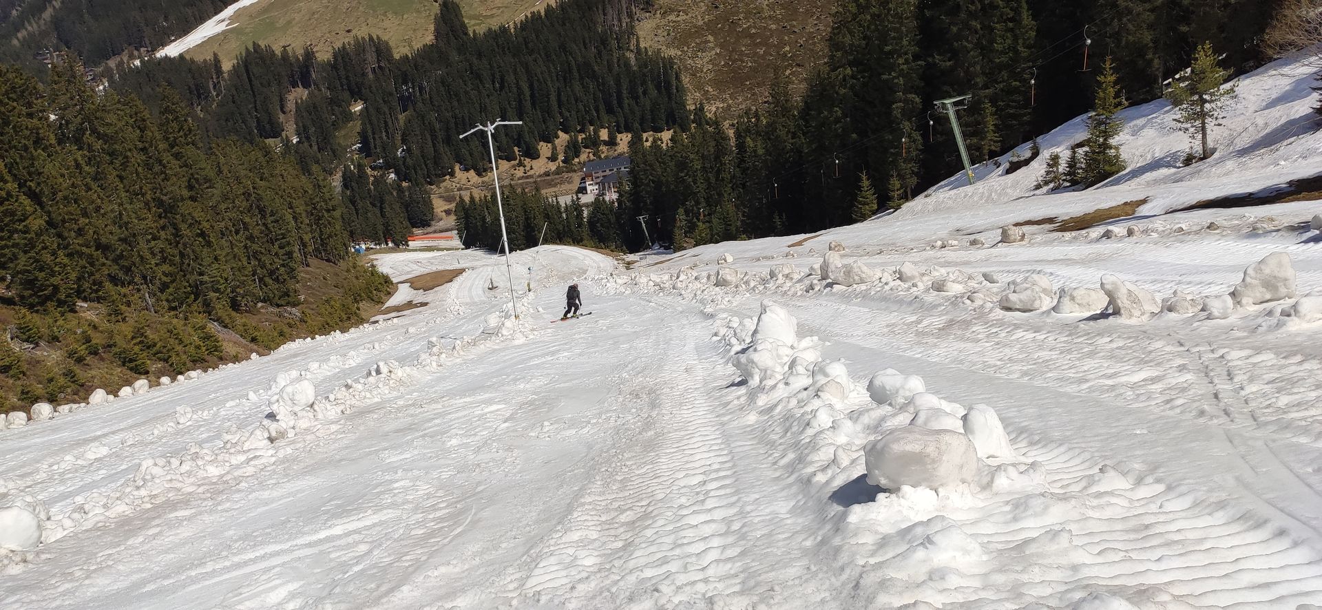 Aufstieg ab 8:30, Schneebeginn neben dem PP. Nach klarer Nacht hart gefrorener, tragender Schnee, Lufttemperatur 0°. Pisten, besonders die, die im Norden des PP enden, etwas ruppig und schmal. Pistenraupen sind im ganzen unterem Bereich, bis zu den Almen, teilweise parallel unterwegs gewesen. Das störte etwas im Aufstieg, jedoch nicht bei der Abfahrt, ab 12:30. In dieser Zeit boten der feinste Firn im freien Gelände, wie auch die nun weichen Pisten besten Abfahrgenuss. Heute, am Freitag wurde im ganzen Gebiet nicht gearbeitet. Die Lifte sind seit dem 18.4. nicht mehr im Betrieb.