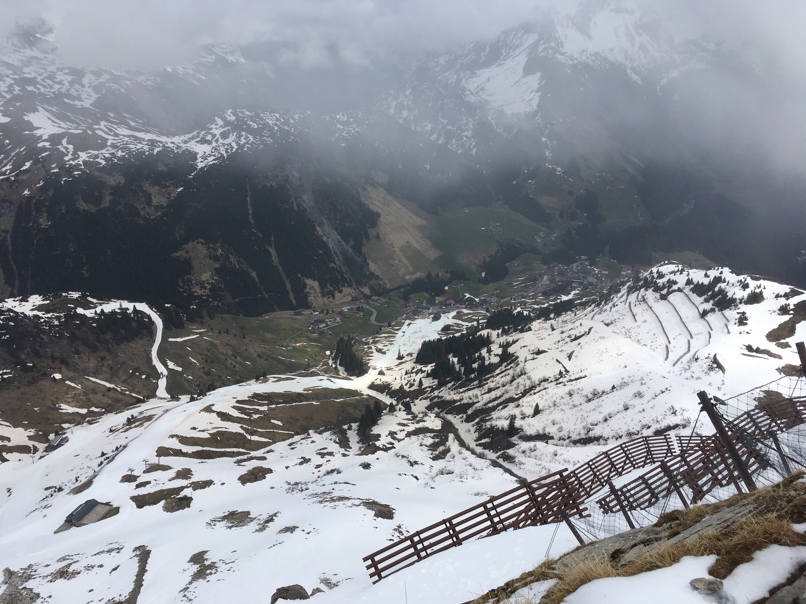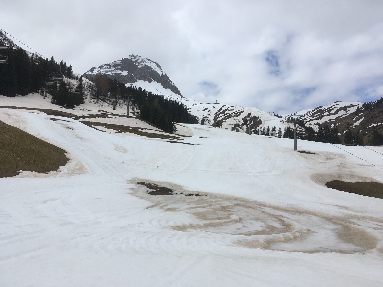 Abfahrt oben saugender Nassschnee, unten Pistenfirn. Es geht noch rauf wie runter durchgehend, aber auch auf den Pisten zeigen sich apere Stellen - ca. 1 Woche könnte es noch gehen, wenn man die eine oder andere apere Stelle in Kauf nimmt (Tour kann man recht gut anhand der Steffisalp-Webcam einschätzen).