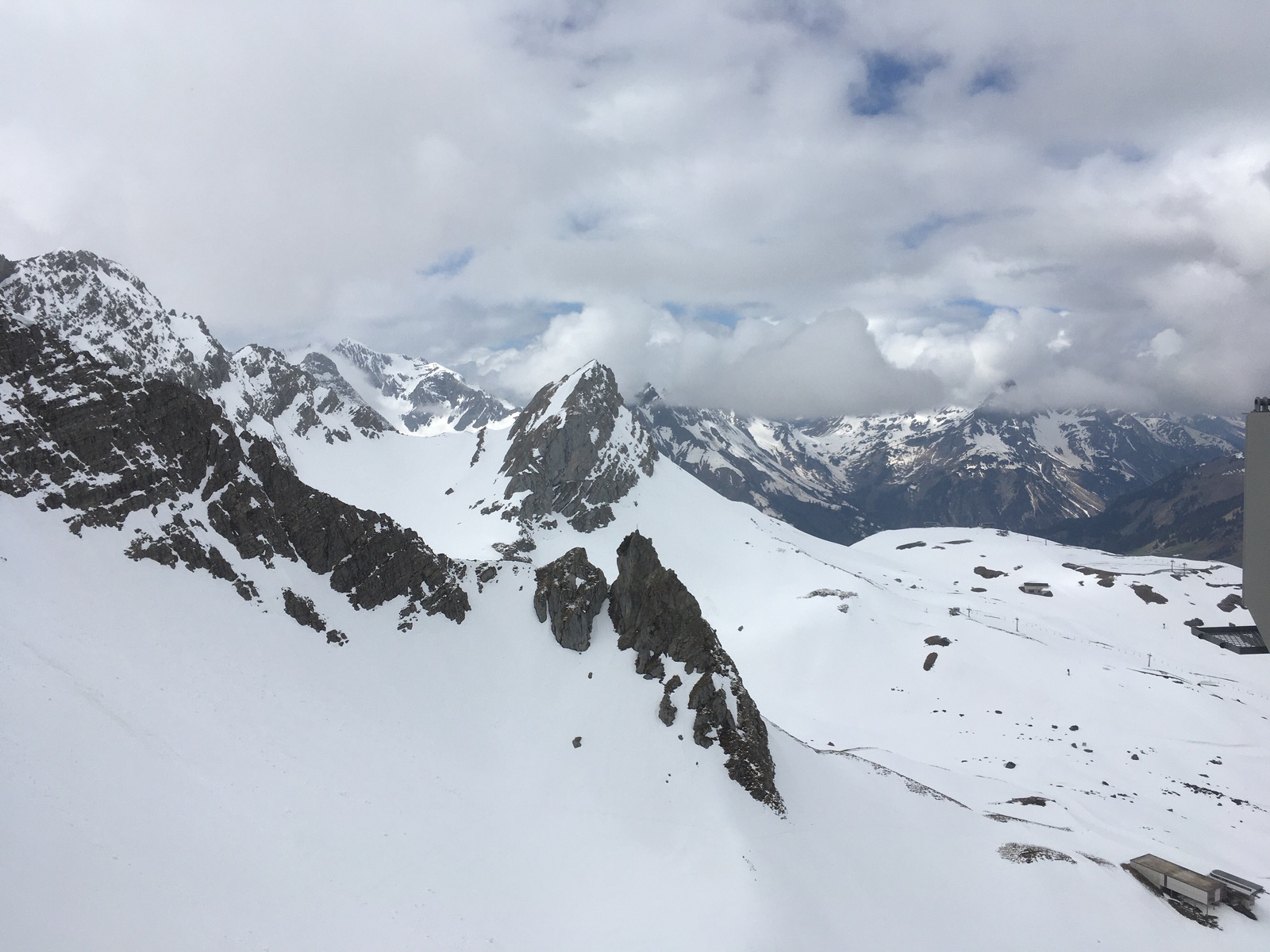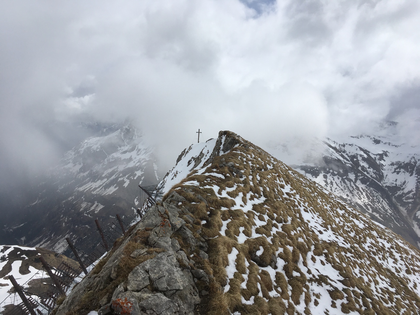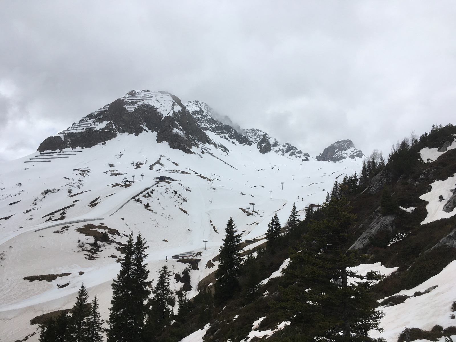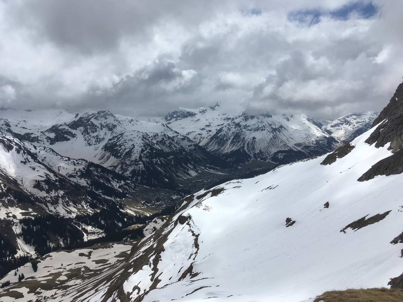 Mittwoch bis Freitag bestes Wetter und gute Skiverhältnisse aber die Pflichten des Arbeitslebens riefen, ab Samstag dann Regen - was tun? Der Alpenvereinswetterbericht sagte für die Gegend um Lech am Sonntag ein Regenfenster voraus, und so war es dann auch. Unten geht man von Warth über die Pisten, die seit einer Woche nicht mehr in Betrieb sind. Nach der Bergstation geht es kurz ins freie Gelände (die "Warther Wanne") und dann ab dem Warther Sattel noch kurz den Grashang hoch zum Gipfel - ein paar Meter gingen noch mit Skiern, die letzten Höhenmeter dann zu Fuß in übel batzigem Gelände - daher auch die Gefahreneinschätzung "mäßig".