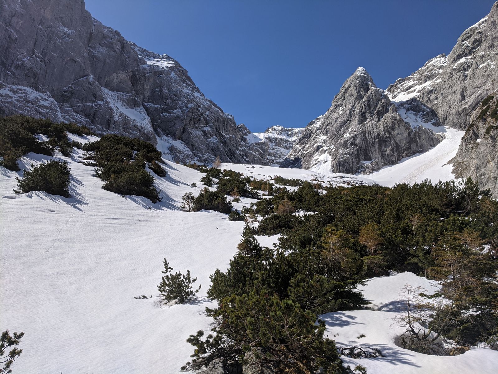 Endlich konnte ich also die Ski anschnallen, als sich die Latschen immer mehr zurückzogen. Hier ist die Schneelage noch sehr gut, man bekommt endlich eine freie Sicht nach oben und ich richtig Lust auf die Abfahrt. Der Schnee war zu diesem Zeitpunkt in der Sonne schon oberflächlich weich und man merkte immer mehr Setzung bei Belastung. Noch kein grundloser Sulz, nichtsdestotrotz versuchte ich nun, Gas zu geben, um die Abfahrt noch genießen zu können und die Lawinengefahr zu minimieren. Die grüne Rinne rechts im Bild sah außerdem sehr verlockend aus und ich spekulierte, in dieser Variante noch etwas besseren, weil sonnengeschützteren Schnee zu finden.