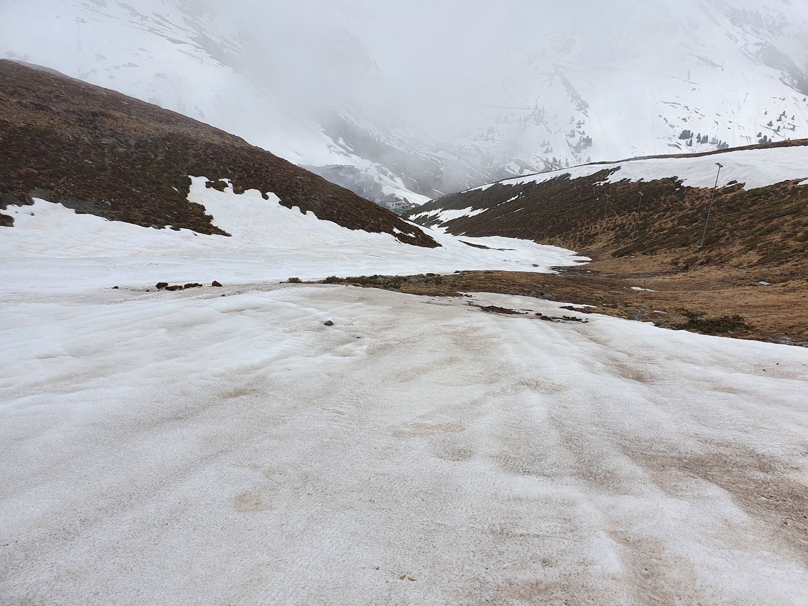 Nachdem mir eine Gruppe entgegenkam mit dem Kommentar "wir waren nur bis zum ersten Lawinenkegel" bin ich dann bis dorthin weiter und habe beschlossen, dort auf ca. 2550m umzukehren: Die Lawine war vor 2 Wochen auch schon da (und geht einfach nicht aus dem Weg ...) aber nach meiner Einschätzung war die Schneedecke insgesamt viel weicher - und bei null Sicht zu gefährlich. Also bin ich auch zurück.