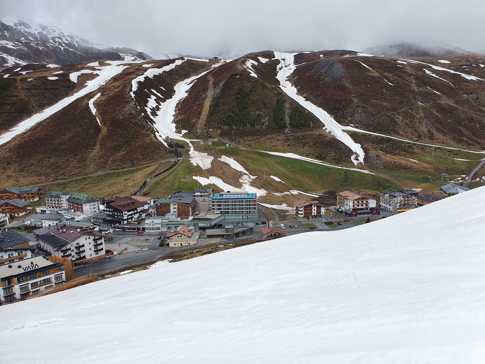Abfahrt: Weil durchweicht und mit schwerer Nassschneeauflage war der Schnee schwerer zu durchpflügen aber ok. Auf der Piste weiter unten (wo kein Neuschnee) völlig entspannte Abfahrt.