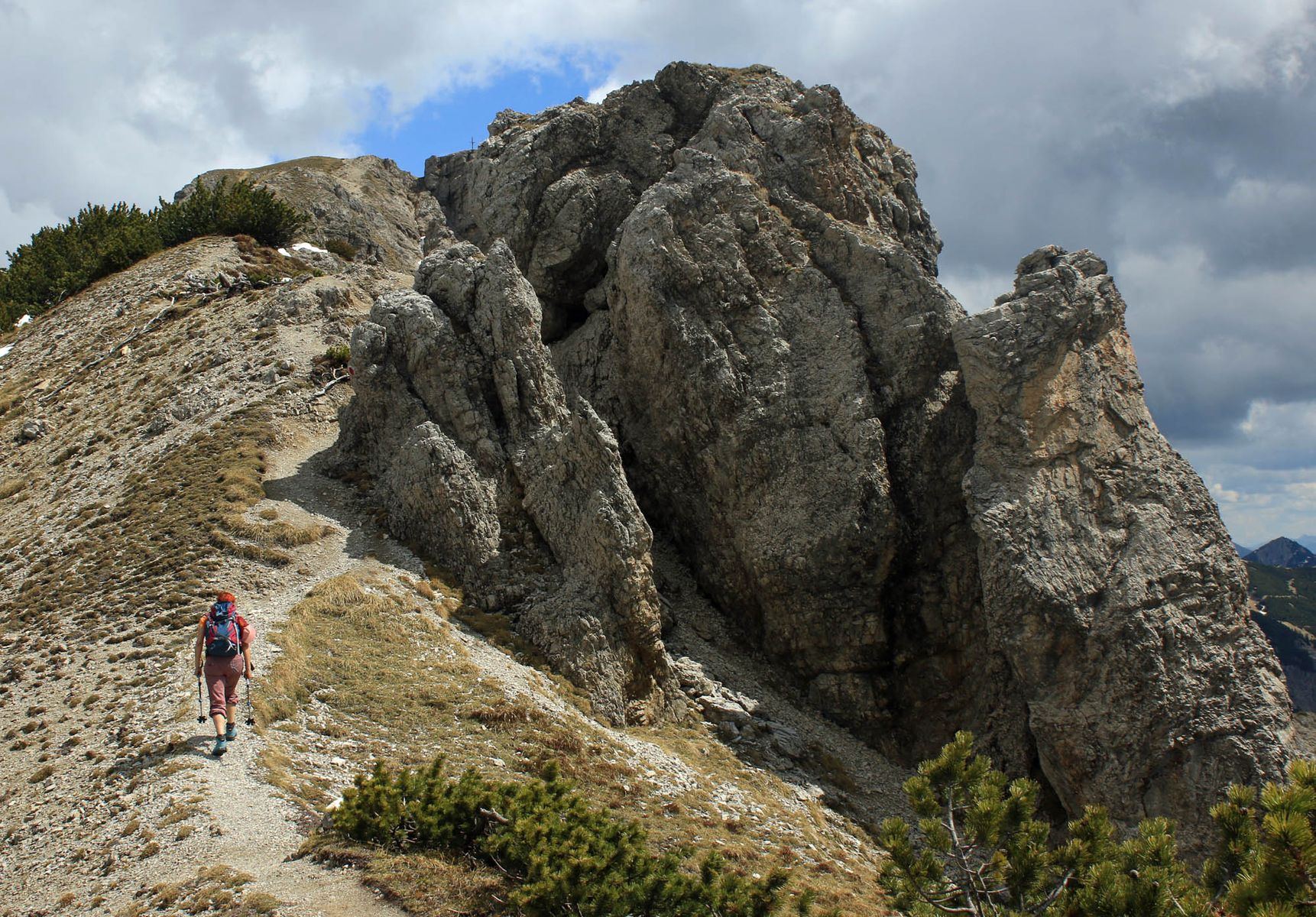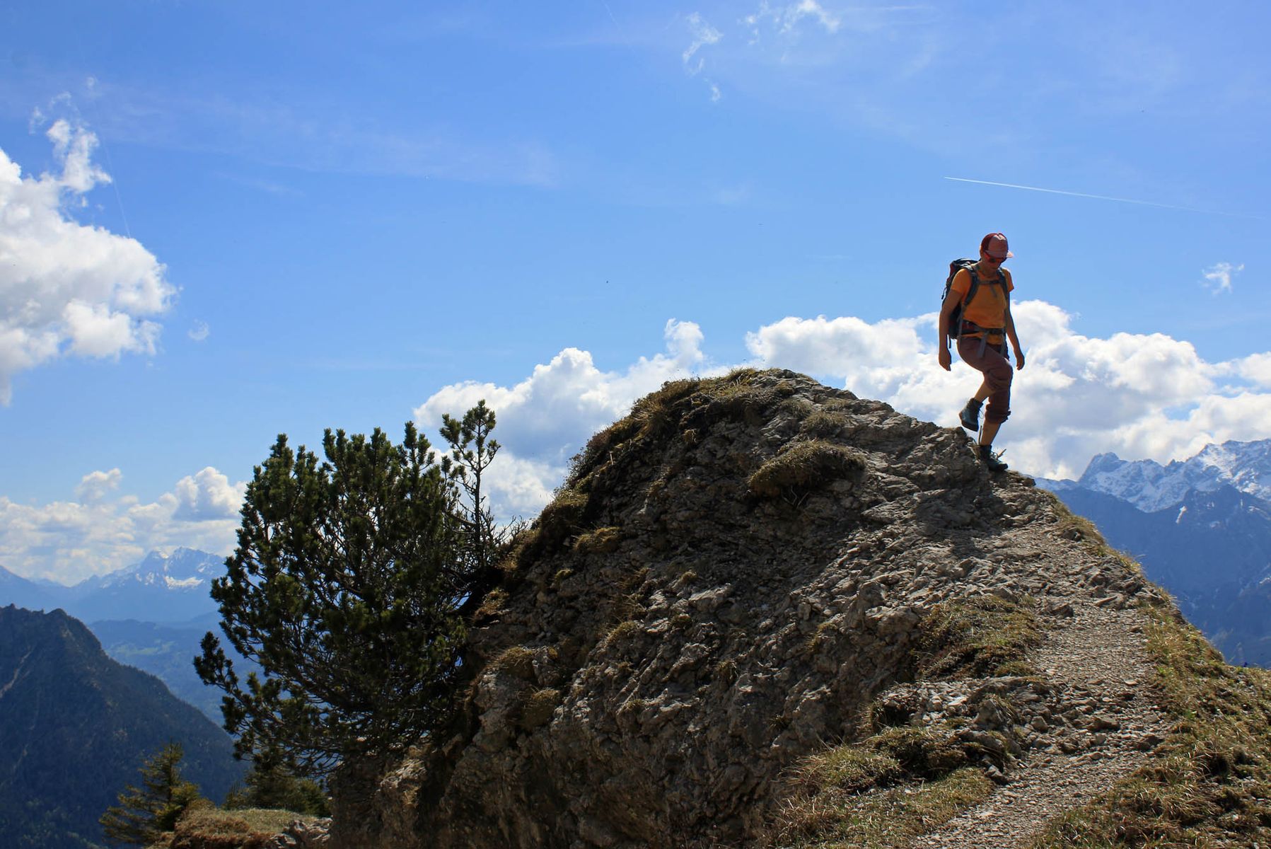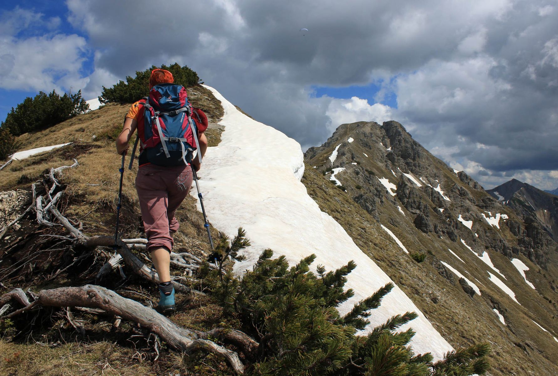 Sommer und Winter können im Mai ziemlich nahe beieinander liegen. Zumindest in den Bergen: So präsentierten sich heute an der Schellschlicht (2052 m/ Ammergauer Alpen) die Hinterlassenschaften der kalten Jahreszeit in Form körperhoher (Rest)Wechten. Im meist festen Altschnee konnte man diese ganz gut begehen oder auch umgehen. An einer Stelle war es aber ratsam, ein Stück in die recht steile Südflanke auszuweichen. Der Anstieg bis zum wunderschönen Gipfelkamm war hingegen komplett schneefrei und frühsommerlich warm.