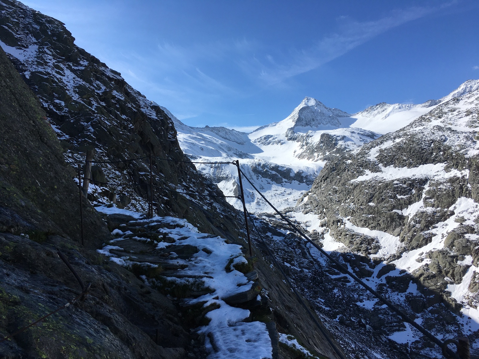 Gestern konnte ich das bessere Wetter als am Wochenende für eine Tour in der Venedigergruppe nutzen. Mit dem Radl (Stromradl von Vorteil, es geht teilweise zackig steil hinauf) ging es durch das Obersulzbachtal bis hinauf zur Materialseilbahn der Kürsingerhütte. Von dort zu Fuß über den Klammlsteig hinauf zur Kürsingerhütte. Offiziell ist dieser wegen Steinschlag gesperrt, das bezieht sich offenbar auf zwei große abgerutschte Felsblöcke, die den Weg an einer ausgesetzten Stelle verlegen. Ist aber gut machbar. Tatsächlich ist aber wohl nicht der ganze Steig gesperrt, sondern nur der erste Teil beim Klamml. Man könnte - und soll wohl auch (wenngleich leider nirgendwo angegeben) - von der Materialseilbahn erst dem Weg zum Gletschersee folgen, um dann über den Wanderweg hinauf zum Klammlweg zu kommen. Es ist also für den Anstieg zur Kürsingerhütte nicht erforderlich, den Klettersteig beim Gletschersee zu nehmen, den ich mit den Skiern auf dem Rücken vermeiden wollte.