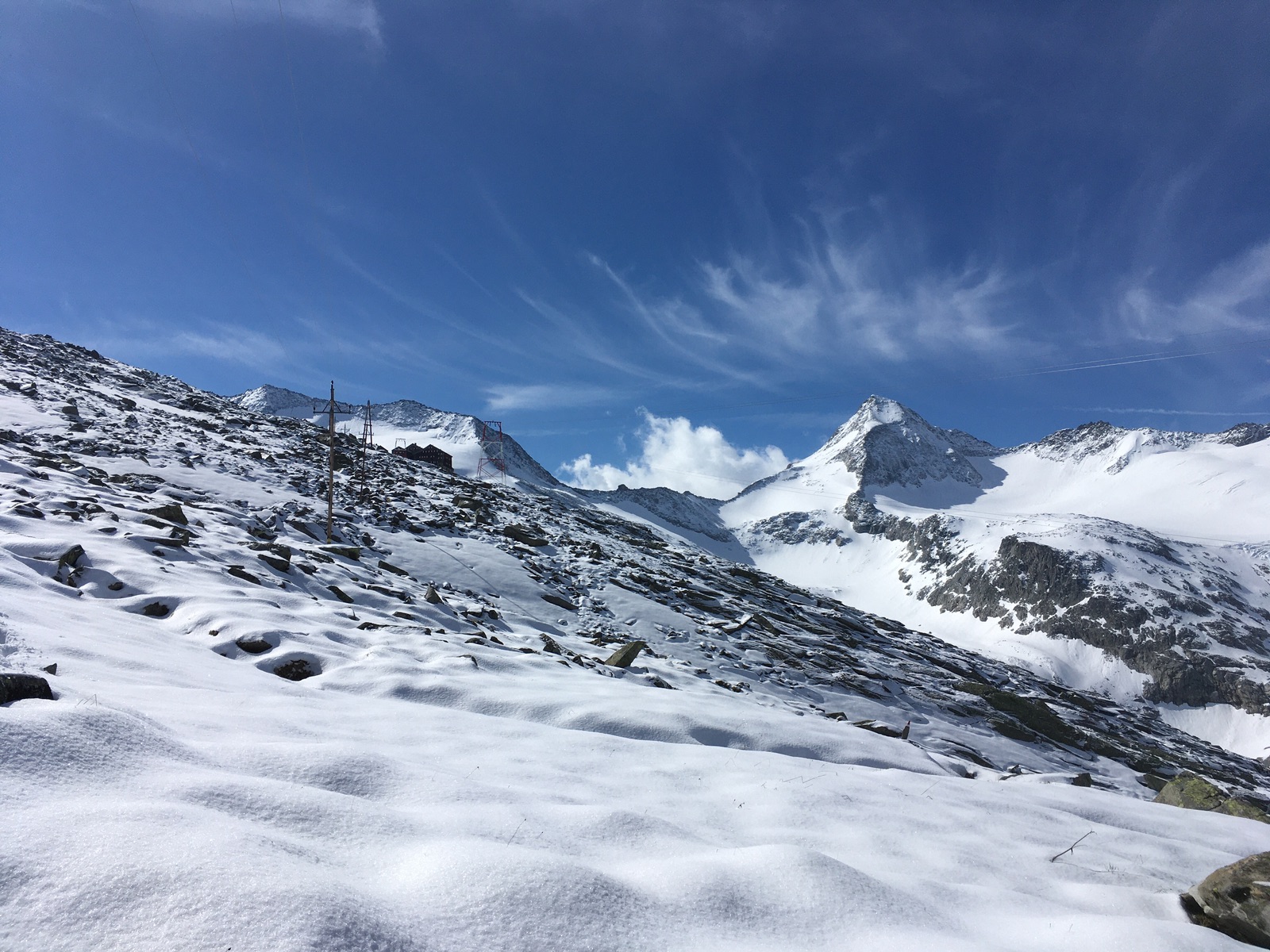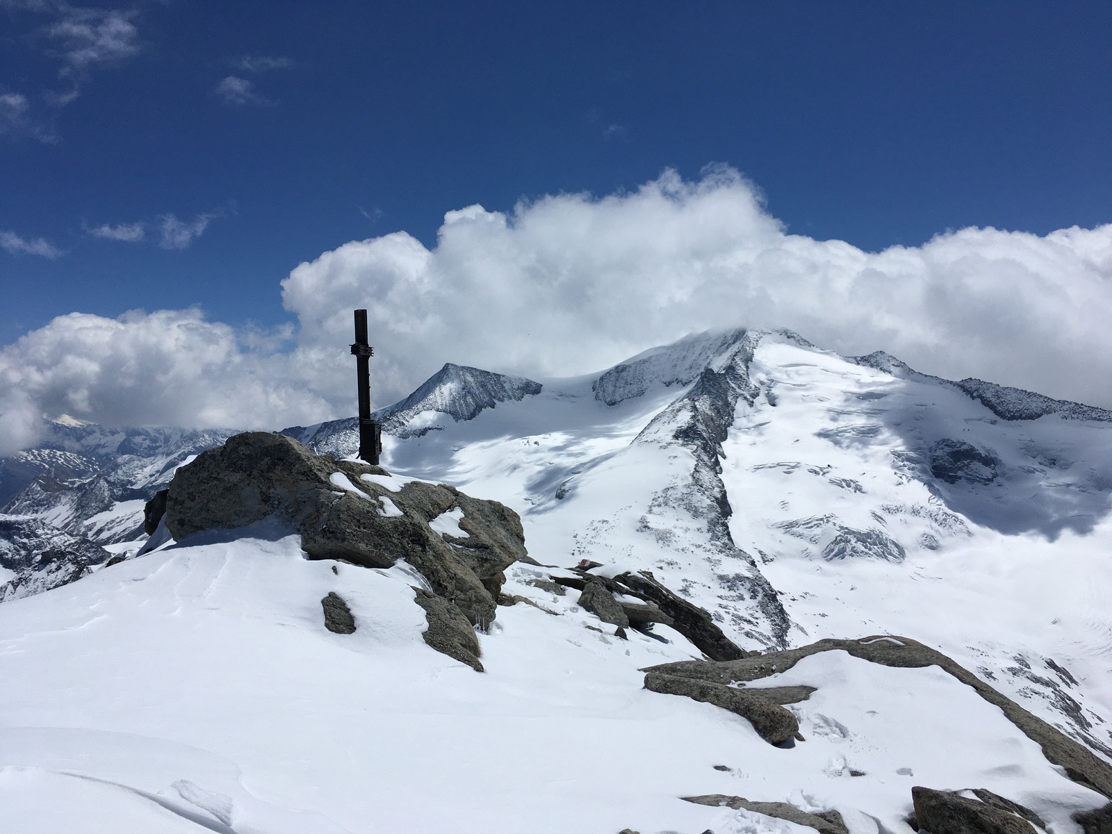 Schon ab der Materialseilbahn lag nordseitig Neuschnee, das Vorankommen war daher etwas erschwert. Insbesondere nach der Hütte war dann durchgehend zu spuren. Im Vergleich zu vielen Beschreibungen im Internet, die den Keeskogel als kleine und einfache Tour darstellen, fand ich es bei diesen Verhältnissen durchaus anstrengend. Immer wieder brach man (zu Fuß) auch in Hohlräume bei verschneiten Felsen ein. Der Blockgrat zum Gipfel ist oben mit Drahtseilen versehen, die ich bei den gestrigen Verhältnissen gerne annahm.