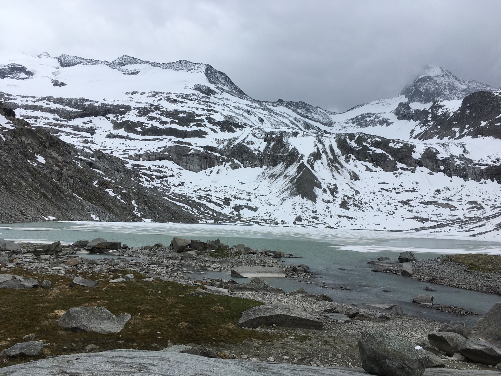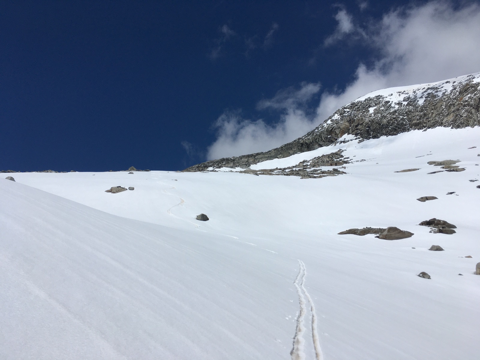 Abfahren konnte man ab ca. 3.100 m (nach dem Blockgrat; zum Gipfel hatte ich die Skier nicht mitgenommen - bei guten Verhältnissen kann auch direkt über die Westwand abgefahren werden). Durch den Neuschnee war der Schnee recht feucht. Bis ca. 2.600 m ging es bei richtiger Spurwahl durchgehend, die Stufe hinab zum Gletscher / oberen Gletschersee ist weitgehend ausgeapert und das Abfahren über Schneereste gepaart mit Tragen, Schneesuche etc. war eher nervig. Es wäre wohl besser gewesen, direkt hinabzusteigen oder sich gleich am Anfang der Abfahrt stark links zu halten, um zum Venedigerkees zu kommen (bei dem man im unteren Teil aber schon einige Spalten sehen konnte). Vom oberen Gletschersee bis zum unteren See konnte man noch durchgehend auf den Nordhängen unter dem Obersulzbachtörl abfahren. Äußerst mühsam ist die Querung im Blockgelände vom einen Ende des Sees zum Wanderweg am anderen Ende des Sees (im Winter geht es über den See oder an den angrenzenden Hängen über Schnee, dann angenehmer).