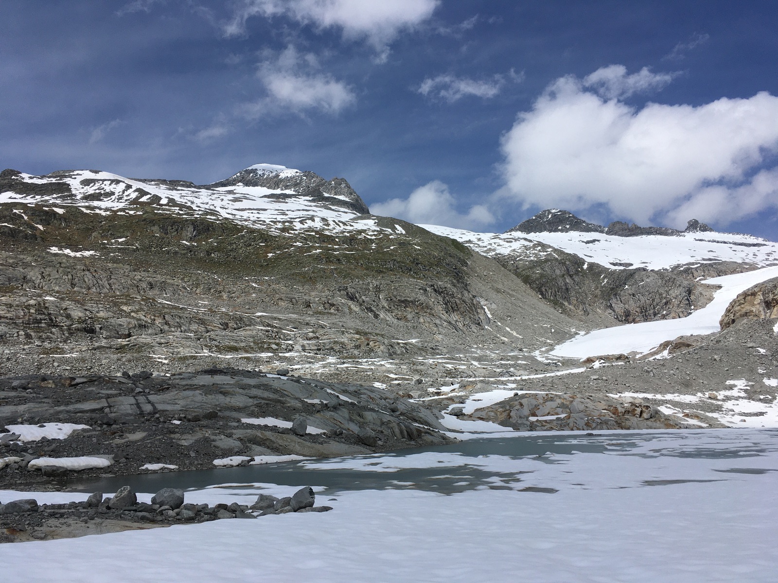 Beim oberen Gletschersee sieht man gut, dass die Stufe 2.600 - 2.400 m weitgehend aper ist (auf Bändern allerdings vom Aufnahmestandort nicht sichtbarer Schnee):