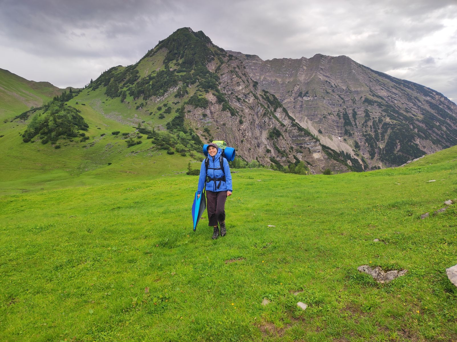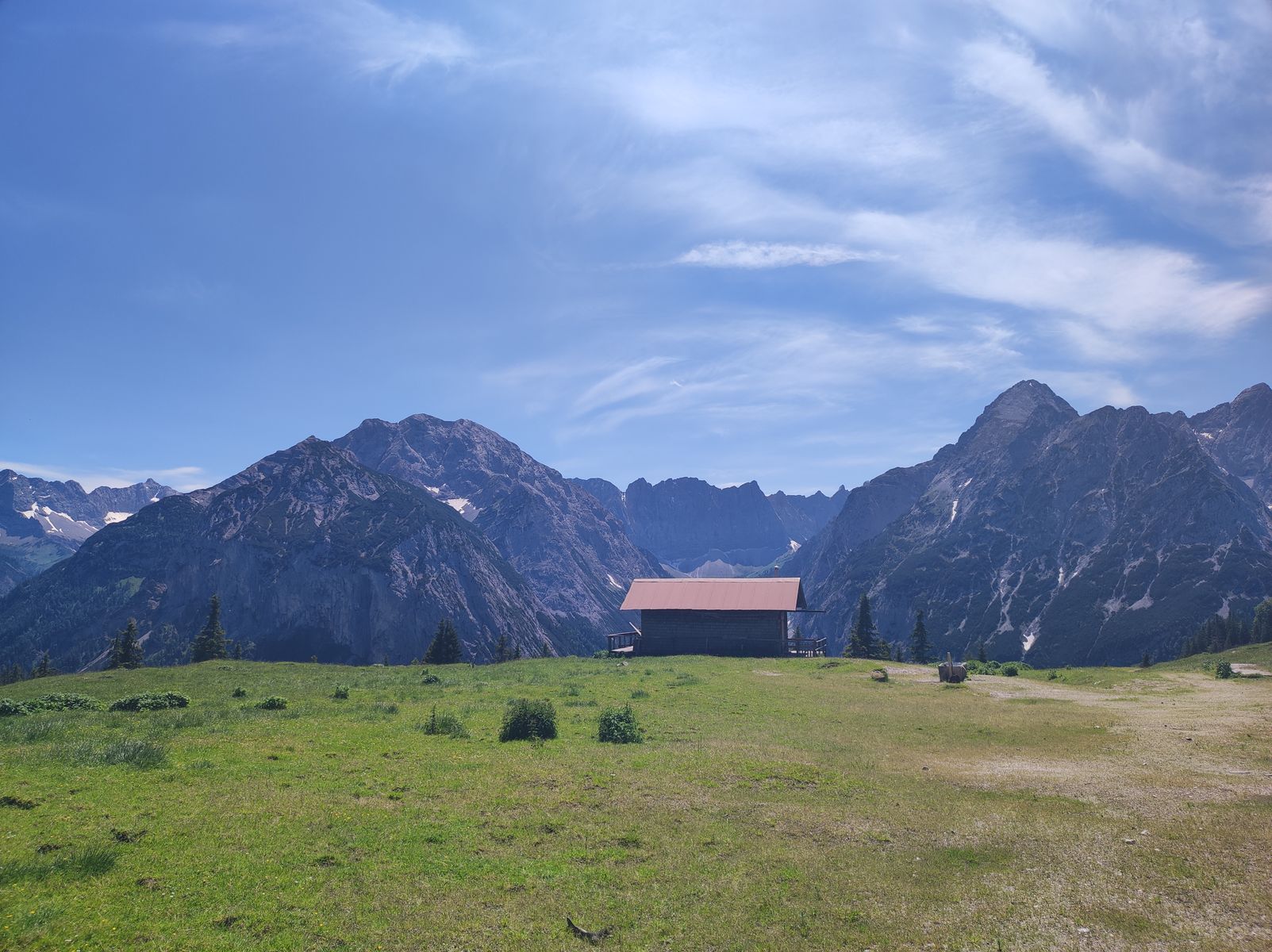 2: Grasbergalm direkt vor den Lalider Wänden (links Gamsjoch, rechts Falkengruppe).