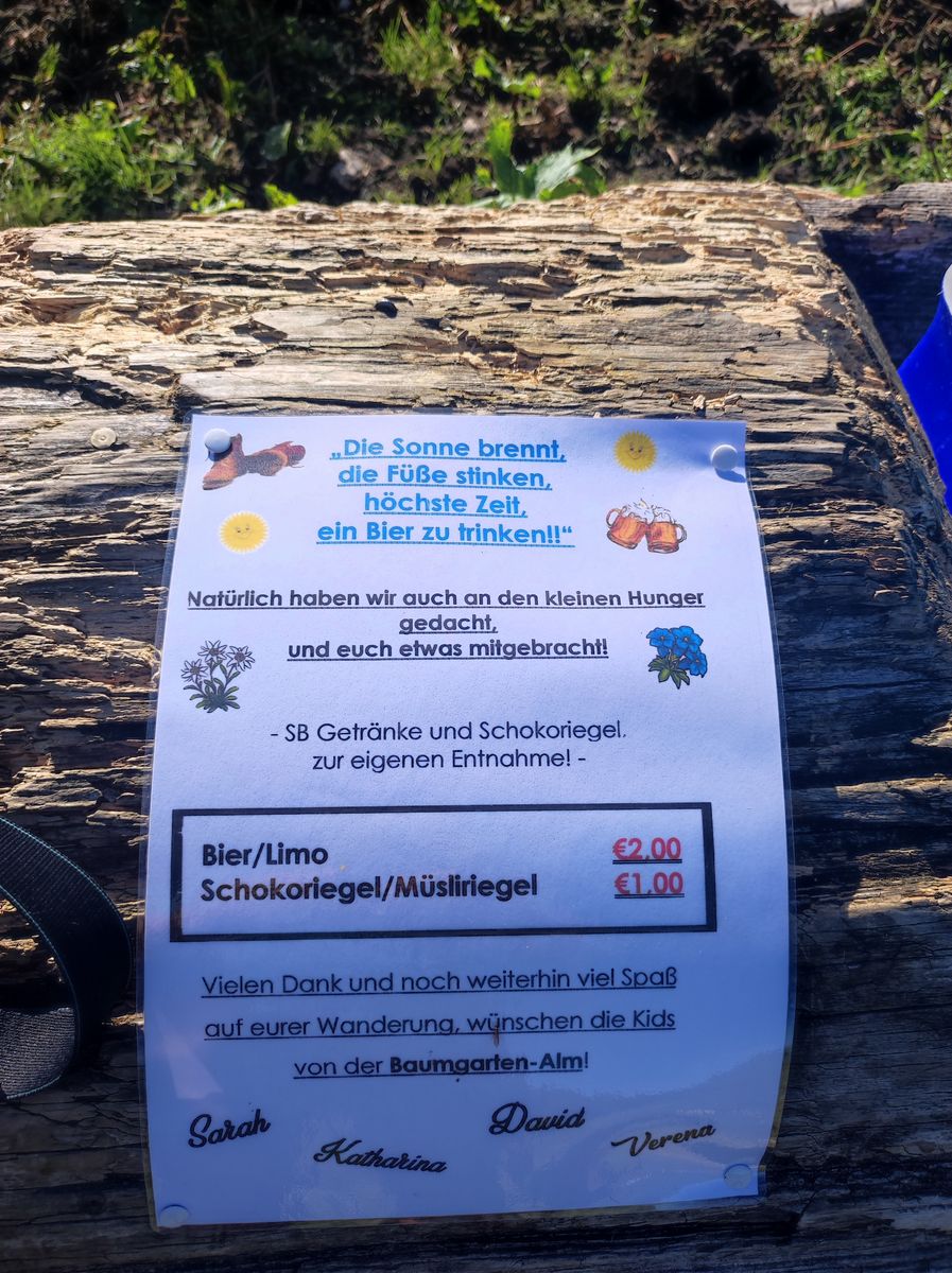 Einen speziellen Dank möchte ich an die "Kids von der Baumgartenalm" (Hochleger, Tag 1) - Sarah, Katharina, David und Verena - richten, die eigentlich unsere Tour gerettet haben, richten! Bei aller Rumplanerei hatte ich nämlich das Wichtigste - die Mitnahme von Süßigkeiten - völlig vergessen, doch an dem von ihnen eingerichteten "Imbiss im Almtrog" konnten wir uns reichlich bedienen! Selbstverständlich unter Hinterlegung der angeschriebenen Preise!