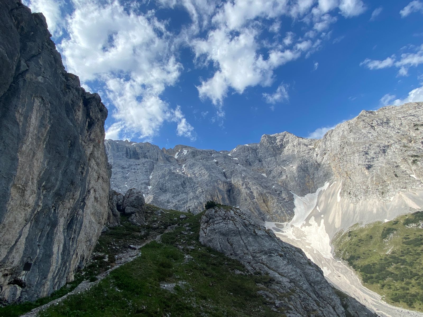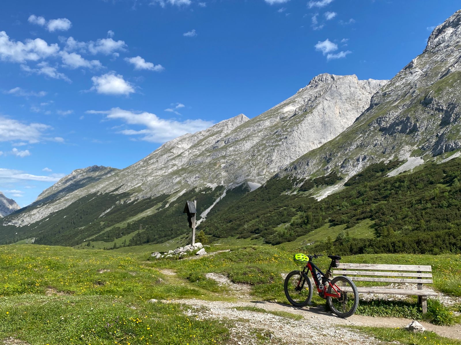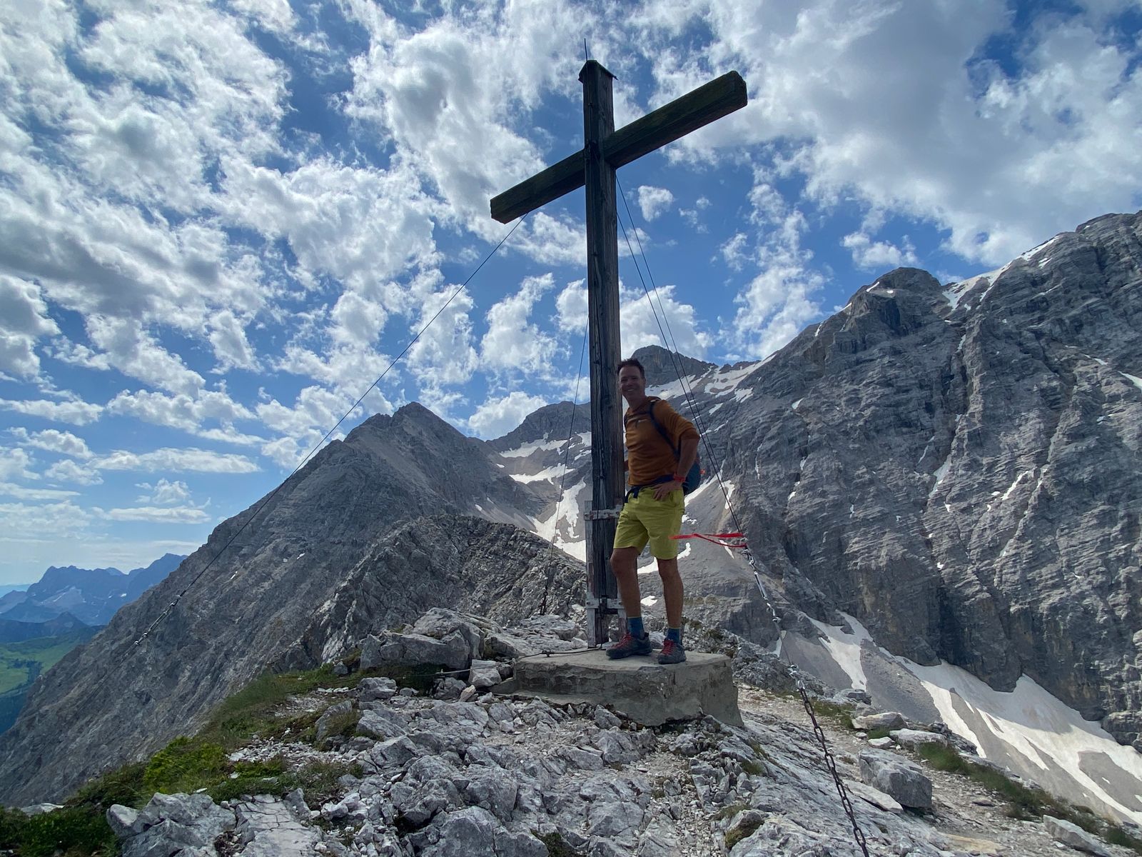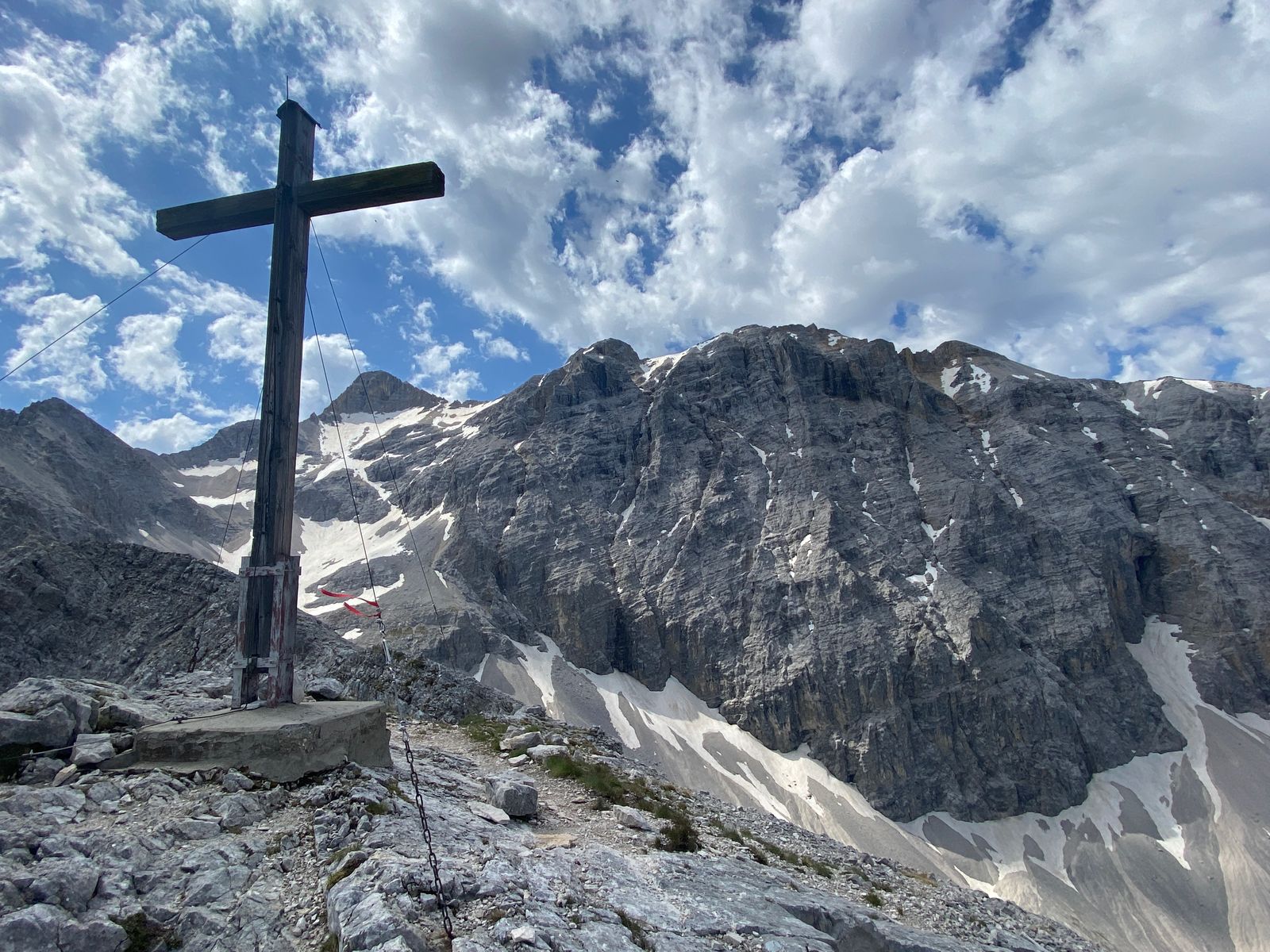 Die meisten Gipfel rund ums Karwendelhaus (u.a. Vogelkarspitze, Östliche Karwendelspitze, Lackengarspitze, Birkkarspitze, Ödkarspitzen) kenne ich schon - aber auf dem Hochalmkreuz, quasi dem Hüttengipfel, war ich noch nie. Also, Premiere... Mit dem Rad über kleinen Ahornboden und Hochalmsattel zum Karwendelhaus, von dort weiter zu Fuß in rund einer Stunde zum Gipfelkreuz. Im Prinzip ist es eine einfache Wanderung mit den paar Drahtseilstellen an der Lawinenverbauung - und im bröseligen oberen Teil sollte man schon trittsicher sein. Schöner Blick ins Schlauchkar und zur Birkkarspitze (die wurde auch gemacht; im Kar liegt noch einiges an Schnee).
