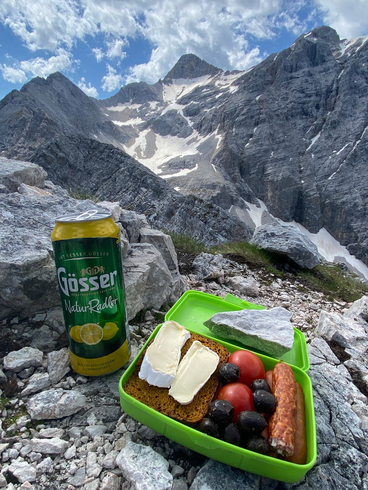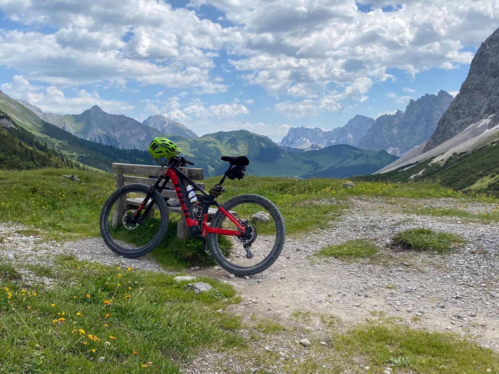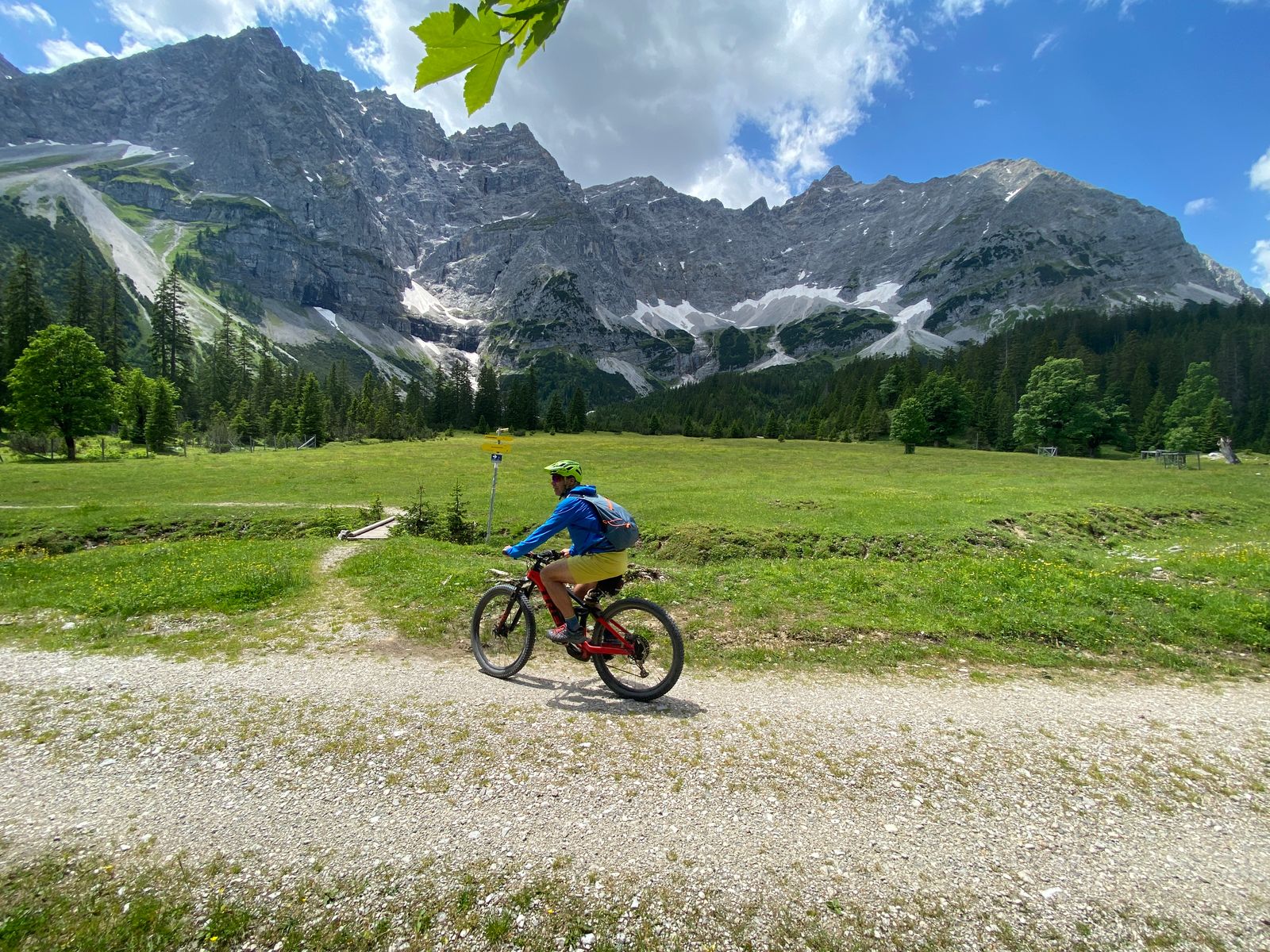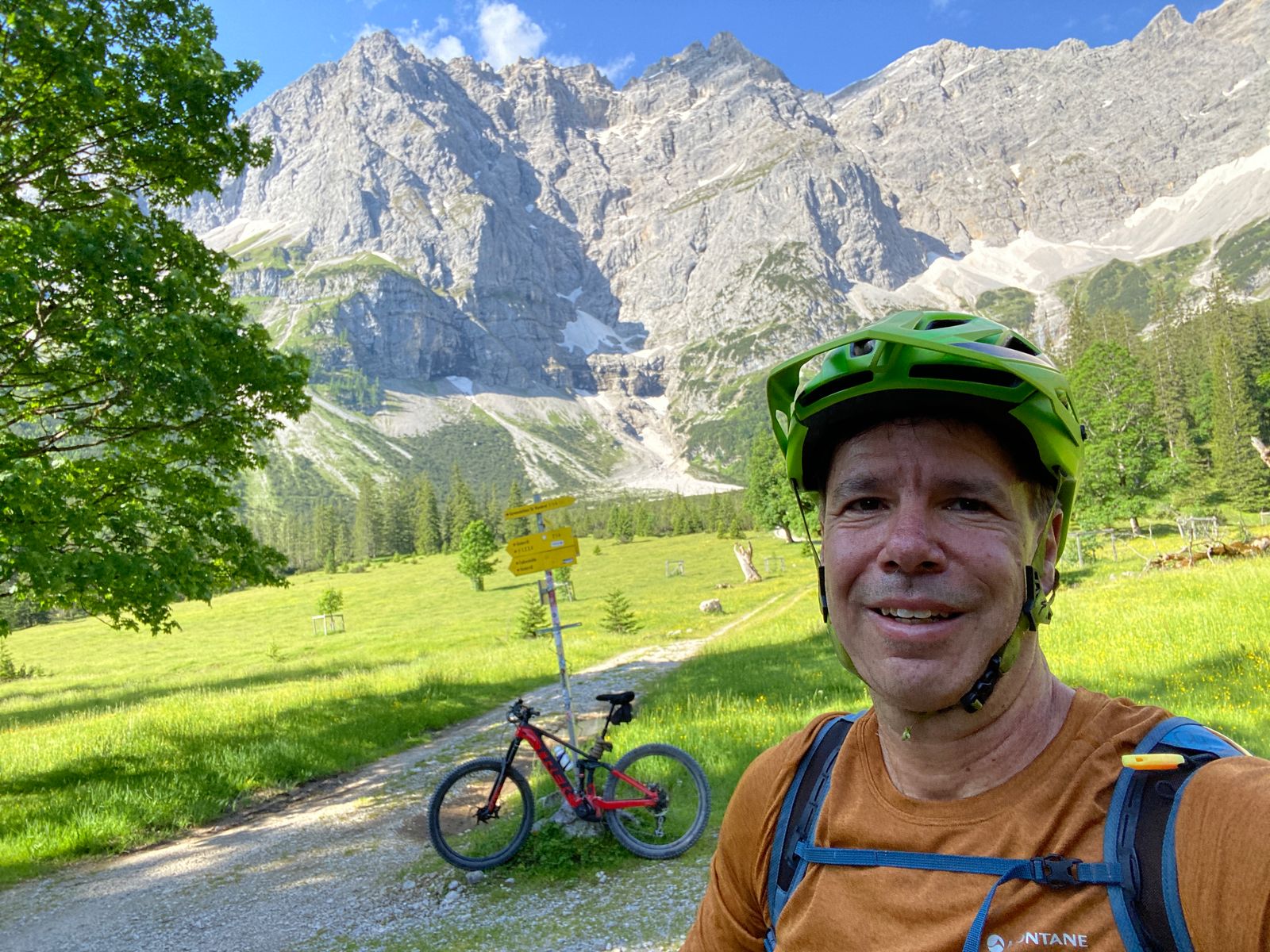 Die meisten Gipfel rund ums Karwendelhaus (u.a. Vogelkarspitze, Östliche Karwendelspitze, Lackengarspitze, Birkkarspitze, Ödkarspitzen) kenne ich schon - aber auf dem Hochalmkreuz, quasi dem Hüttengipfel, war ich noch nie. Also, Premiere... Mit dem Rad über kleinen Ahornboden und Hochalmsattel zum Karwendelhaus, von dort weiter zu Fuß in rund einer Stunde zum Gipfelkreuz. Im Prinzip ist es eine einfache Wanderung mit den paar Drahtseilstellen an der Lawinenverbauung - und im bröseligen oberen Teil sollte man schon trittsicher sein. Schöner Blick ins Schlauchkar und zur Birkkarspitze (die wurde auch gemacht; im Kar liegt noch einiges an Schnee).
