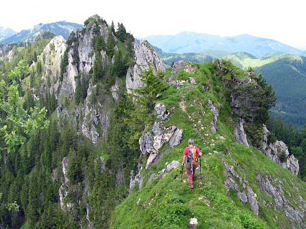 Tourenverhältnisse: Im sehr steilen Wald stellenweise feucht und entsprechend rutschig - hier muss man aufpassen! Am Kamm dann selbst überwiegend gute Wegverhältnisse, wobei man im ausgesetzten Kammgelände absolut trittsicher sein sollte bei dieser Tour. Außerdem ist guter Orientierungssinn gefragt, dass man den nicht markierten Pfad - teilweise nur Wegspuren oder wegloses Gelände - auch die richtige Route trifft. Dafür sehr einsame Tour.