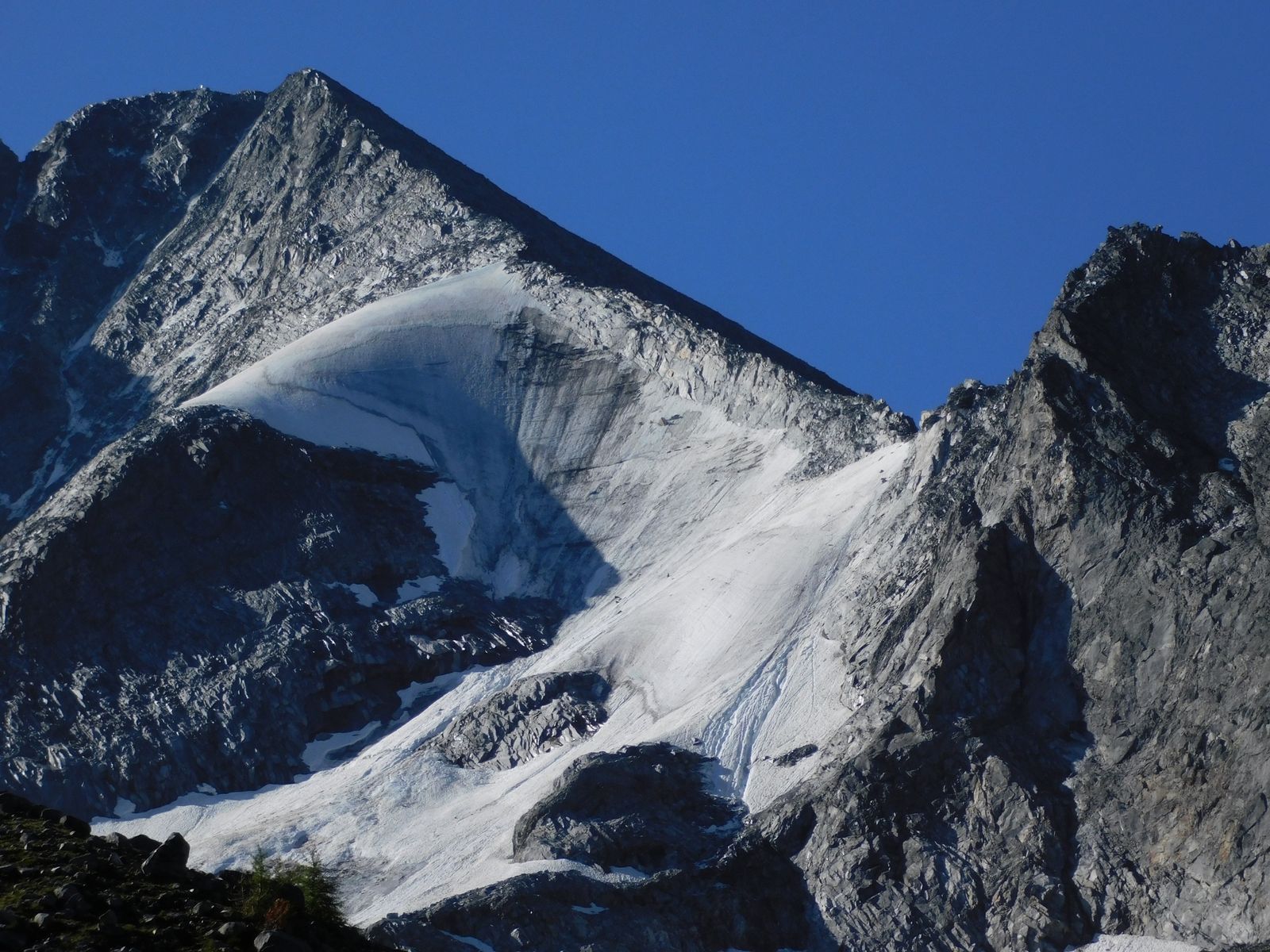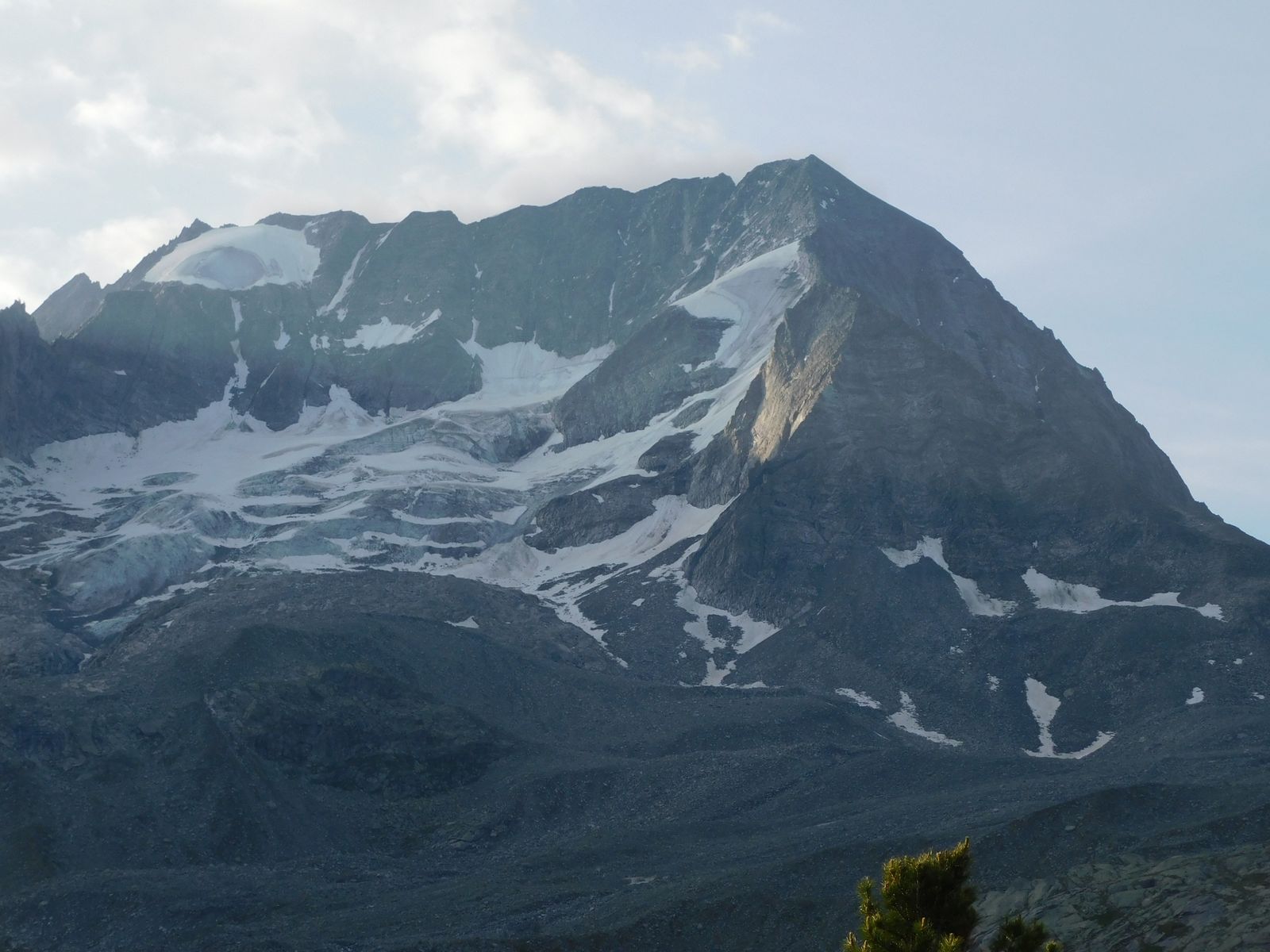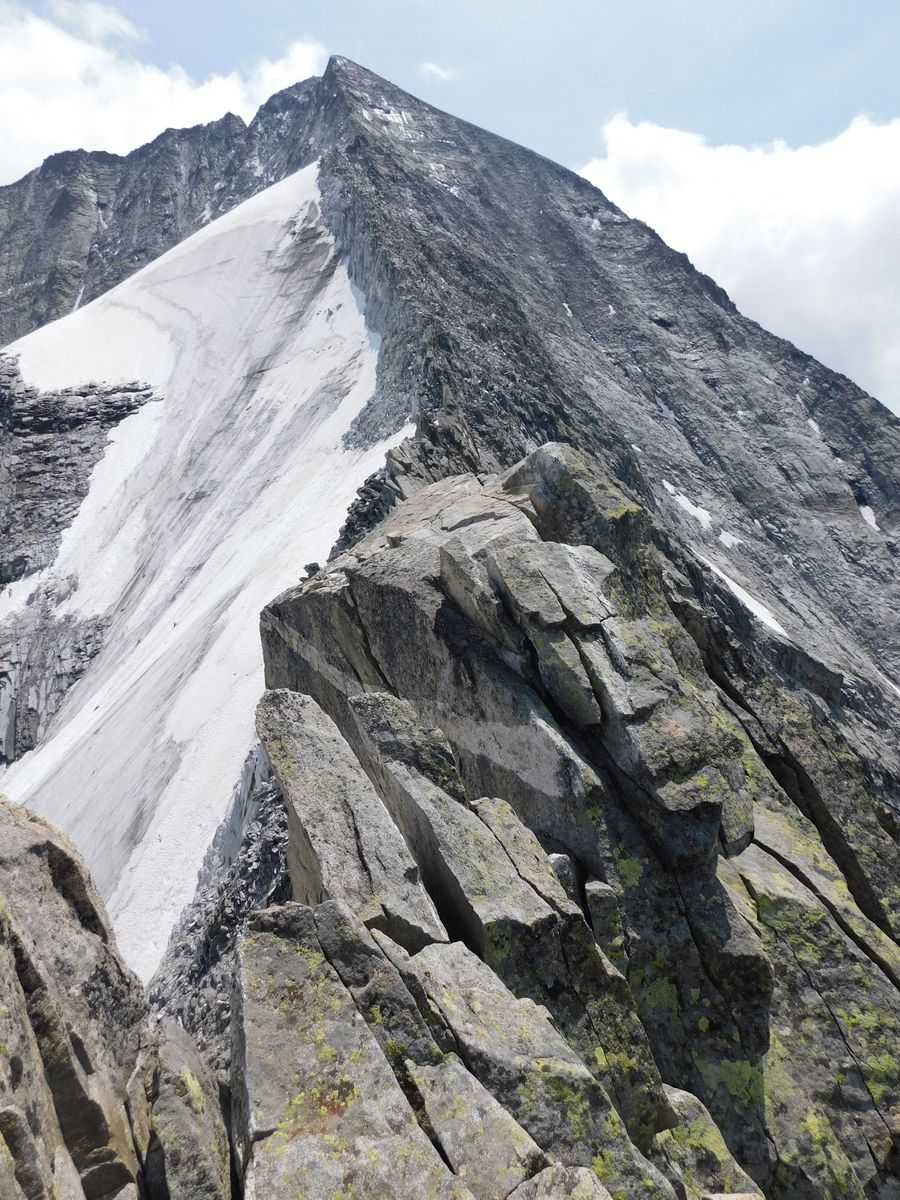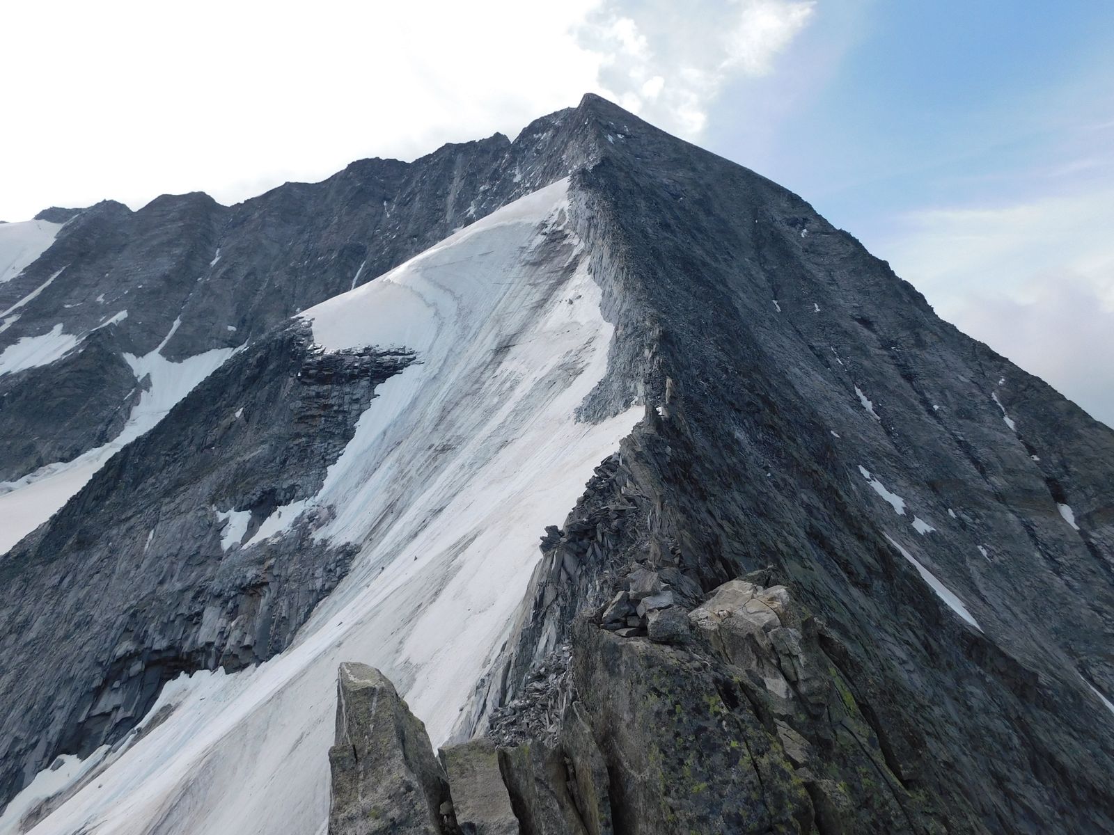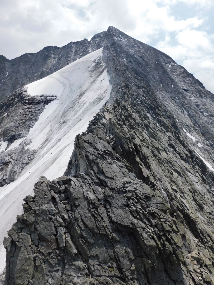 Hochgall-NW-Grat an einem anderen Tag, von Nordwesten aus gesehen (vom Arthur-Hartdegen-Weg). Dort sieht er schon deutlich flacher aus als in der frontalen Ansicht von der Kasseler Hütte: