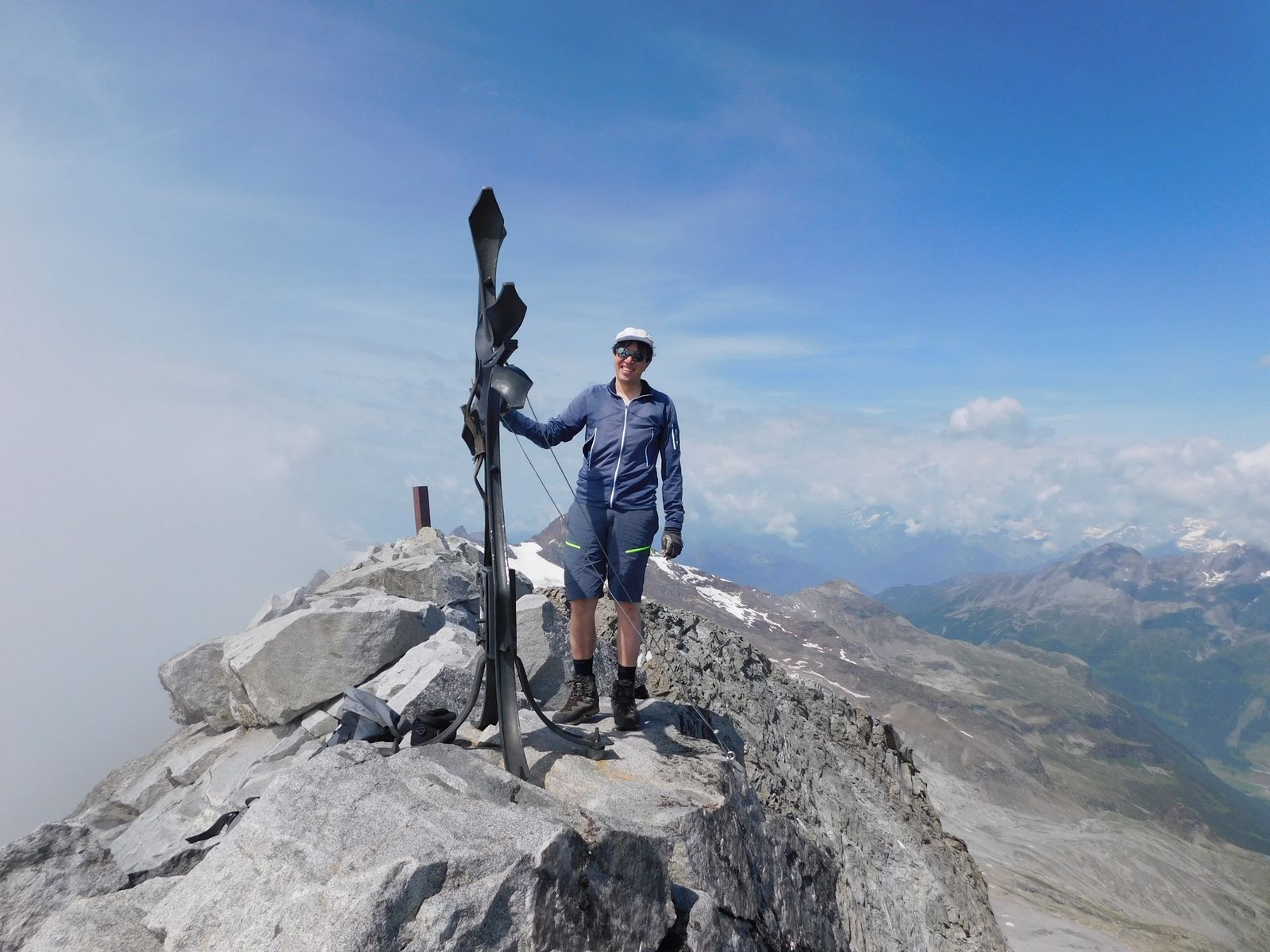 Am Grat hat mich noch ein Südtiroler überholt, der netterweise das Gipfelfoto von mir gemacht hat. Ansonsten war an diesem Tag keiner auf der Route unterwegs (was wohl selten ist):