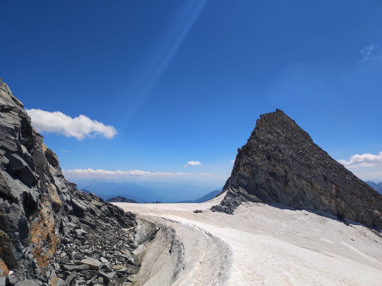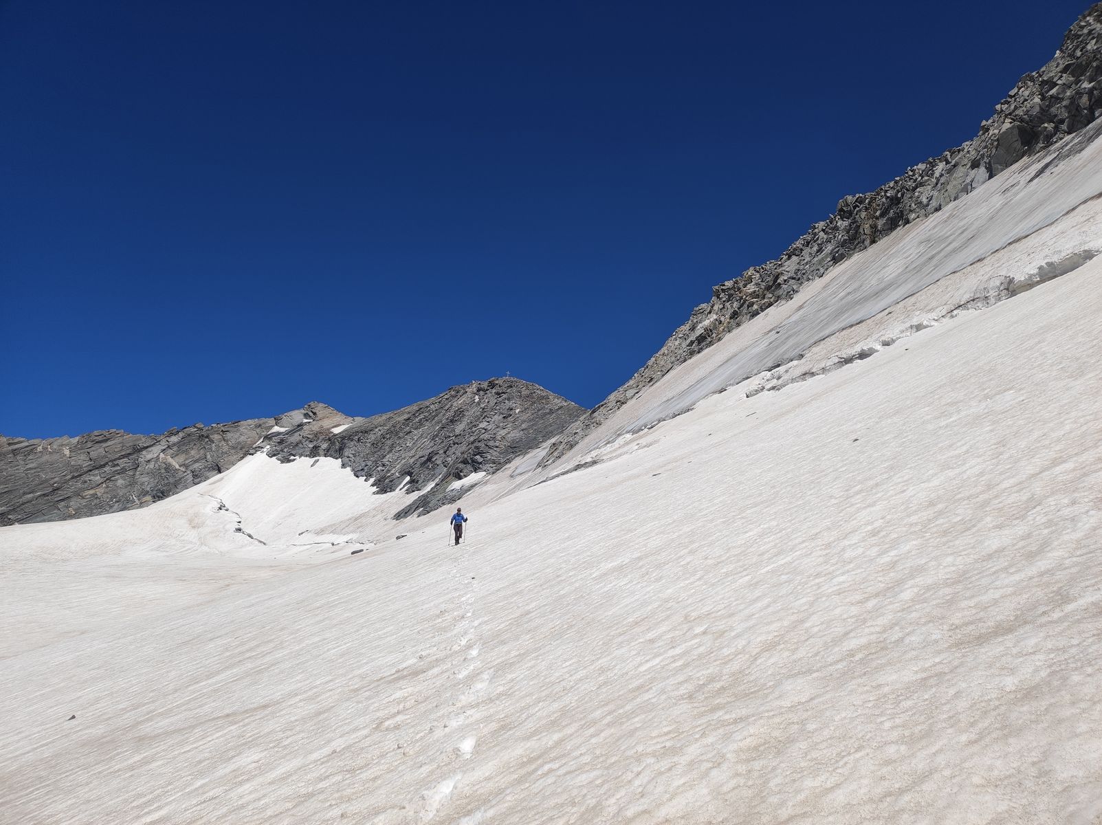 Am Gletscher sind Steigeisen sehr hilfreich, wenn nicht gar obligatorisch, denn die obersten 30 Höhenmeter der recht steilen Gipfelflanke (~35 Grad) sind bereits blank. Danach guter Trittfirn; Randkluft unproblematisch. Der Gletscher ist ziemlich harmlos, aber nicht ganz spaltenfrei - kurz vor der Weißzintscharte gibt es eine zwar schmale, aber tiefe Spalte. Mit ein bisserl Aufmerksamkeit kommt man gut durch. Ein Seil braucht es meines Erachtens nicht.