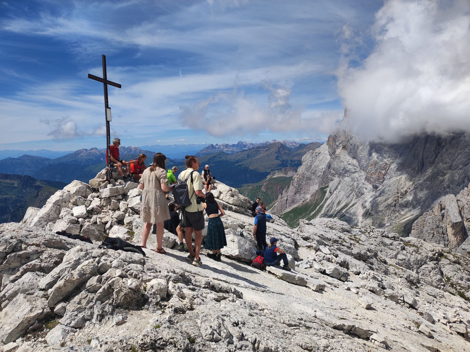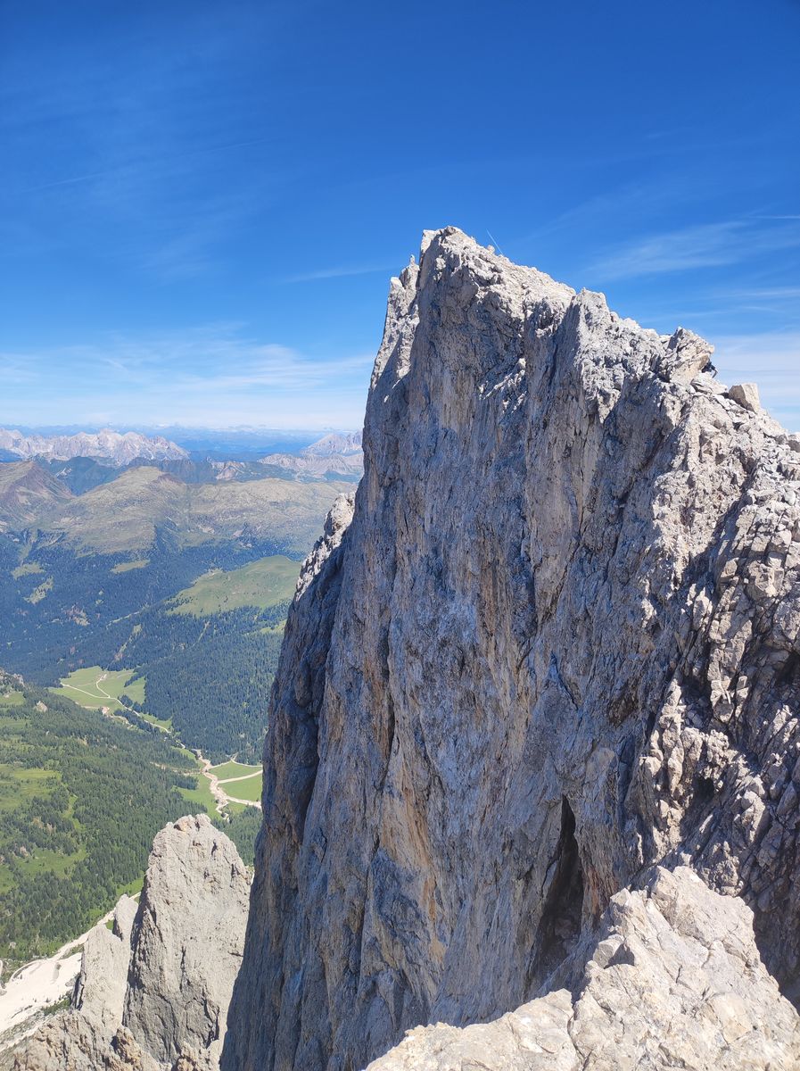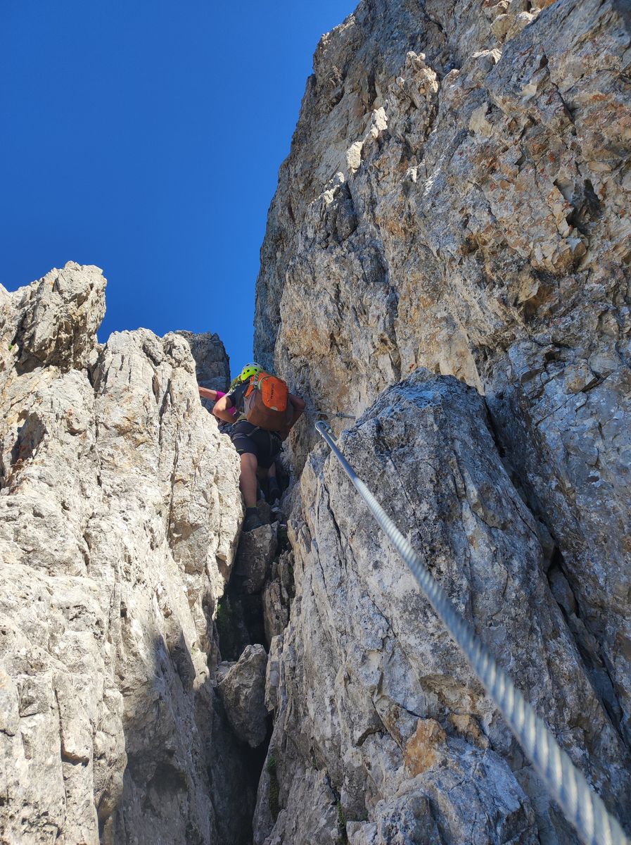 2. Ein früher Aufbruch empfiehlt sich dennoch sehr; man sollte spätestens um halb 9 am Einstieg der Bolver-Lugli sein, da danach dann die ganzen Ferratisti kommen, die mit der Gondel zum Col Verde hochfahren. Der KS ist nämlich zurecht sehr beliebt. Ich hab ein bisserl verschlafen und bin um 7 los - das hat bei zügigem Gehtempo noch gerade so gereicht.