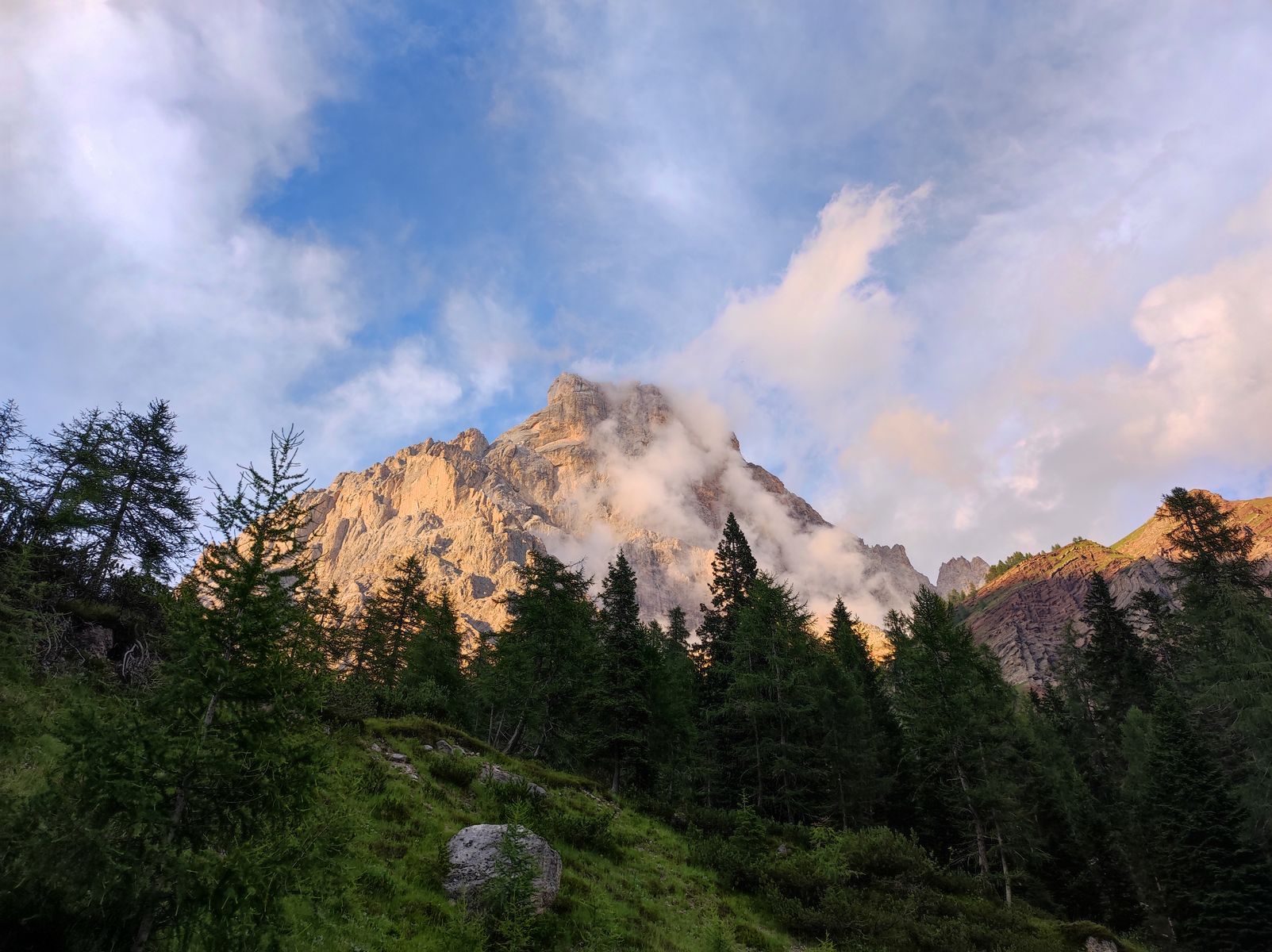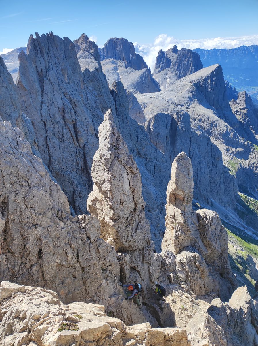 Heute morgen ging es dann, gleich zu Beginn souverän Schilder, die den Sentiero del Cacciatore wegen Baumfällarbeiten für gesperrt erklären, ignorierend (zurecht, da ein klassischer Fall von "Schild nach getaner Arbeit vergessen") zum Col Verde. Hier der Beschilderung zur Via ferrata Bolver-Lugli folgend über selbige hinauf zum Bivacco Fiamme gialle. Ein toller Klettersteig (max C)! Das Seil ist wirklich nur zur Sicherung da und man kann schön im Fels klettern. Vom Bivacco kurz hinab in den Passo die Travignolo und hinauf zur Cima della Vezzana - grandiose Fernsicht!