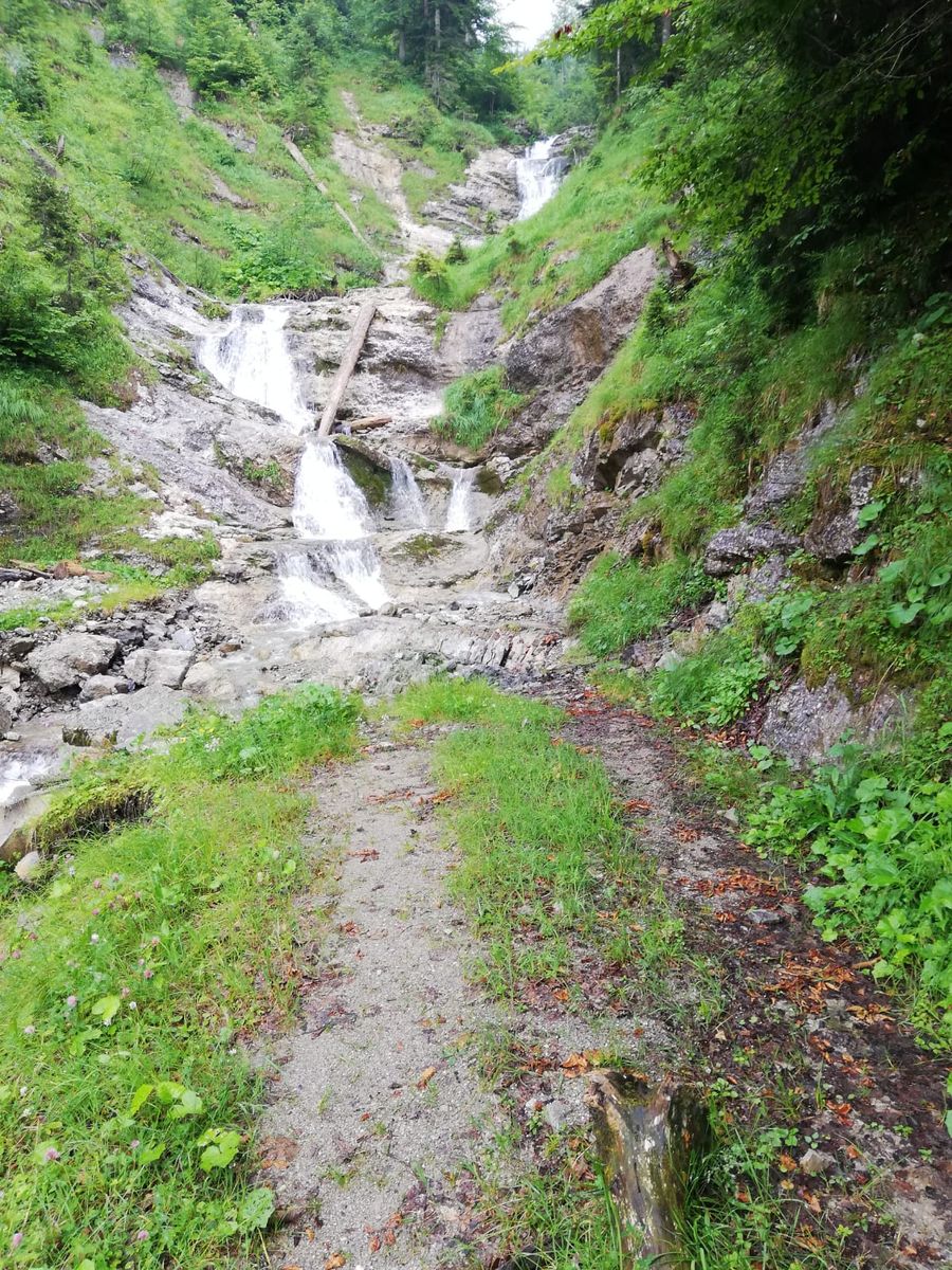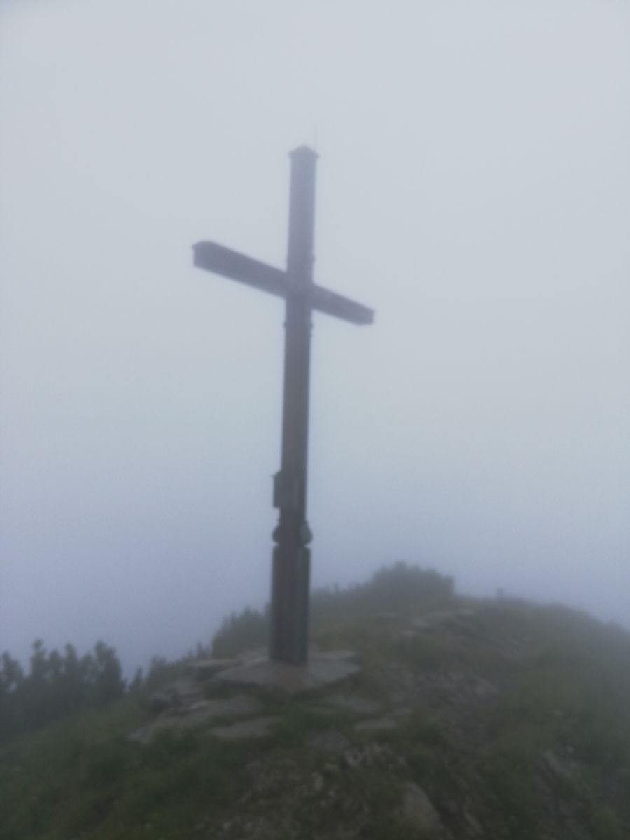 Heute eine ziemlich nasse Tour, meist von unten, teilweise auch von oben. Von der Walchenklamm über den langen Nordrücken und das Dürrnbergjoch zum Gipfel. Kaum Sicht, oben auch windig,frisch. Abstieg nach Süden zum Zotenalm-Mittelleger und über die Forststraße hoch zur Rotwandlhütte. Ab hier dann interessant, weil ich ja wieder zur Walchenklamm musste und keine Riesenumwege gehen wollte. Deshalb zunächst weglos durch steile Grashänge und dann über sumpfige Wiesen nach NNO Richtung Roßkopf, von wo laut AV-Karte BY12 Steigspuren nach Norden bergab führen. Der Beginn ist recht ausgeprägt und deshalb mit etwas Gespür zu finden, das Steiglein selbst ist häufig grasüberwachsen, führt auch kurzzeitig durch Gebüsch und lässt sich oft nur erahnen, ist aber immer da und führt zum oberen Ende von Wiesen runter. An deren unteren Ende beginnt eine Forststraße, die mehrfach von Muren unterbrochen bzw weggespült ist, zu Fuß aber problemlos. Nach einiger Zeit (vgl. Karte) zweigt von der Straße (da, wo diese wieder bergauf führt) nach links ein deutlich erkennbarer Steig ab und führt zu einer tiefer gelegenen zweiten Forststraße. Die läuft man dann bis zur Bundesstraße raus und dann noch ca. 2km zurück zum Auto, je nach Parkplatz. Man lasse sich nicht an dem Eck, wo die Forststraße von Nordrichtung nach Osten abbiegt, von dem kleinen Steig verführen, der gerade abwärts führt und locker 3km ersparen würde - wenn man unten nur über den Walchenbach drüber käme!! Aber da hilft nur schwimmen! Dieser Abstecher macht rund 50Hm zusätzlich aus.