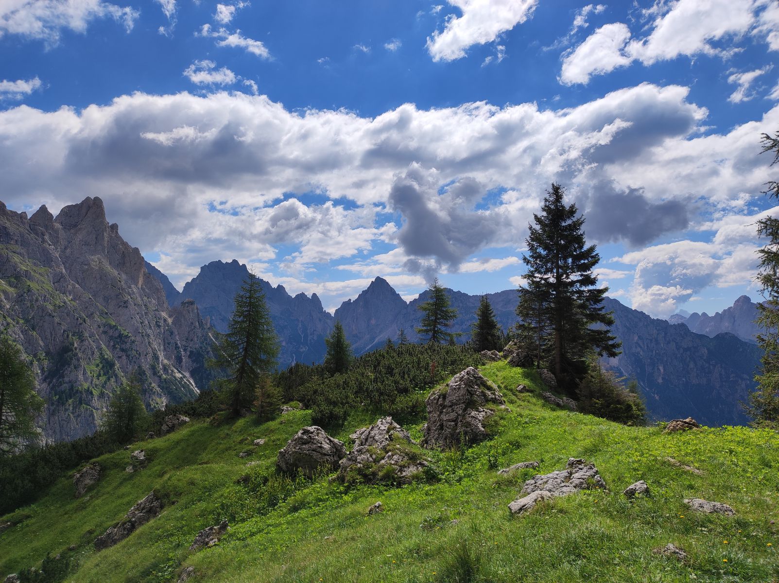 2. Vermeintliche Wegsperrung: Bei der oben angesprochenen Weggabelung auf 2450m wird der Sentiero Cacciatore als gesperrt ausgewiesen, was aber irreführend ist - vielmehr ist ein Querweg viel weiter unten (zurecht wegen des Windwurfs von vor zwei Jahren, der noch nicht beseitigt wurde) gesperrt. Beim Beginn des Sentiero unten ist auch richtigerweise kein Sperrschild. Als ich bei der Weggabelung angekommen bin, stand dort gerade ein anderer Bergsteiger, der die Runde anders herum als ich gegangen ist. Er war natürlich sehr dankbar für die Info, dass der Weg in Ordnung ist. Nebenbei sind alle Leute, denen ich begegnet bin (und natürlich über die Sachlage informiert habe), anders rum gegangen, aber das nimmt sich nicht viel. Die Via ferrata Dino Buzzati ist im Abstieg sehr spaßig.