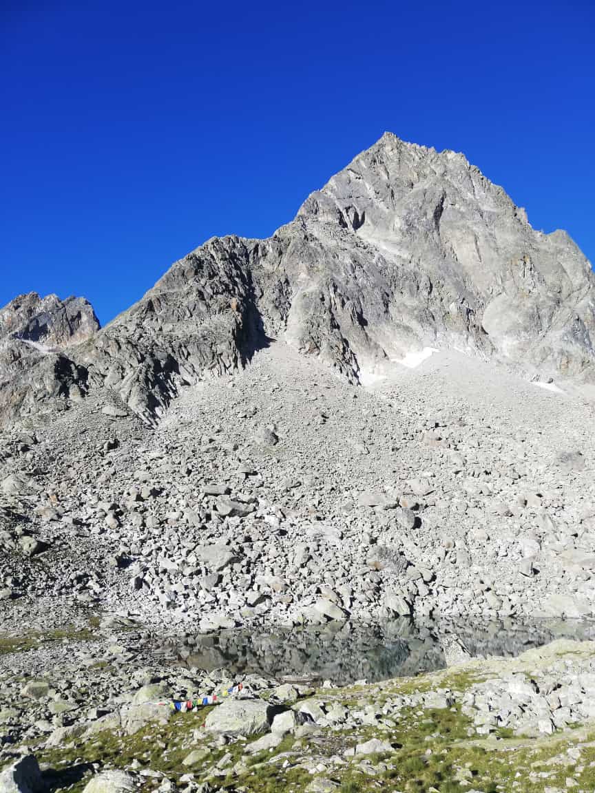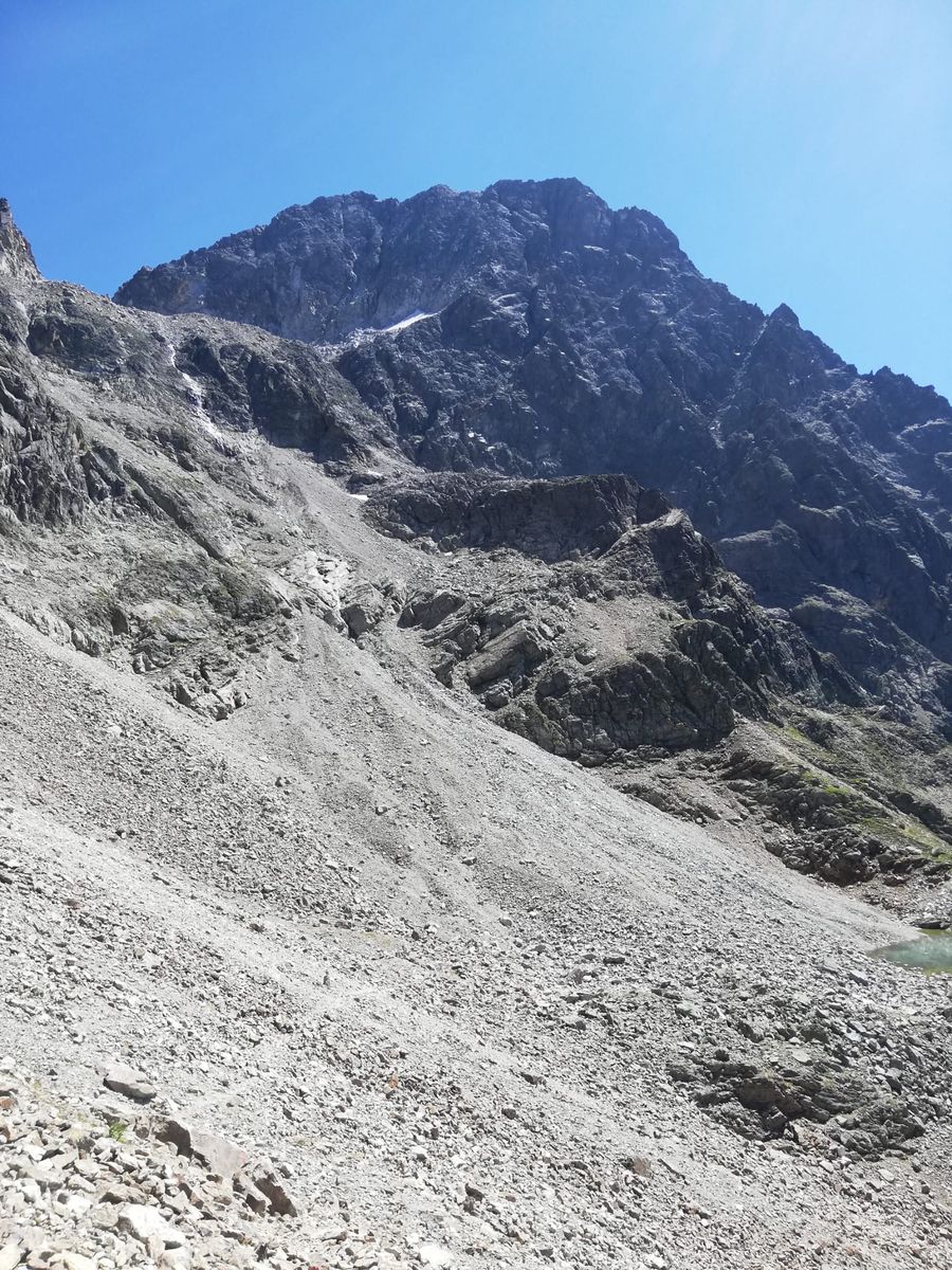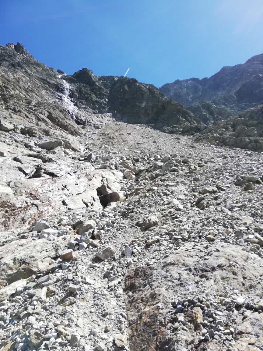 Auch der Weiterweg ab dem (ehemaligen) Schnee-/Eisfeld bleibt steil, die Spuren werden weniger deutlich, sind aber zu finden. Rund 130Hm Gegenanstieg zur Mittertalscharte hinauf und dann auf dem markierten Steig wieder talaus zur Straße.
