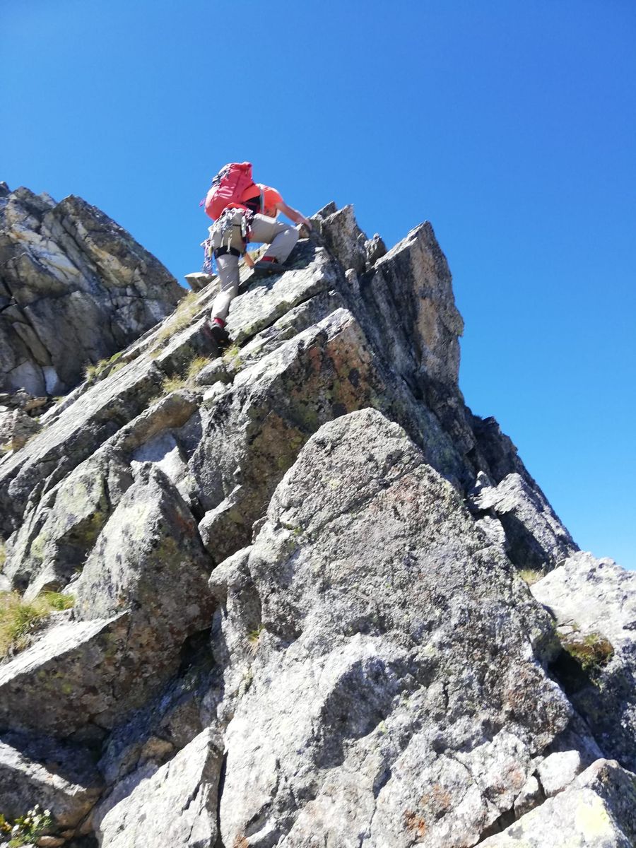 Vom Parkplatz über die Staumauer und auf dem Wanderweg ins Längental bis auf etwa 2420m, dann abzweigen zum kleinen Maningsee und über Geröll zum Einstieg. Bis zur ersten IVer-Stelle ier-IIer-Gelände, seilfrei sinnvoll. Die beiden IVer und zugleich schwersten Stellen der Tour liegen relativ nahe beieinander und sind jeweils wenige Meter lang. Der Rest ist fast durchwegs I - II, einmal III-, viel über plattiges Gelände, das aber schön mit Rissen durchzogen ist. Nach der Scharte zwischen Maningkogel und Acherkogel nochmal zwei IIIer-Stellen (Kamin), die einem eher leichter vorkommen, der Rest stellenweise noch III-, meist II. Insgesamt recht schön.