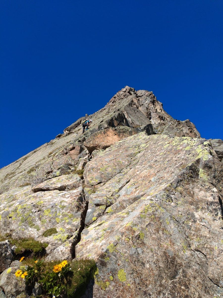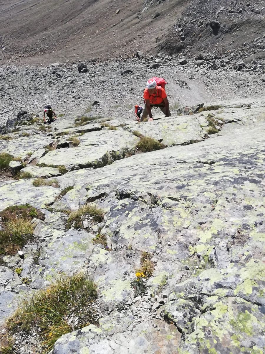 Mindestens genauso anspruchsvoll wie der Aufstieg ist der Abstieg, der markiert durch sehr steiles IIer-Gelände nordseitig hinabführt. Auch hier stecken Haken und die Gefahr, Steinschlag auszulösen und Vorausgehende zu gefährden, ist hoch.