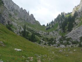Weitere ca. 450 hm und 2 km in ca. 1,5 Std. zu Fuß zum Kenzenkopf, den man vom Sattel aus schnell erreicht. Der Kenzenkopf ist vor allem oben etwas ausgesetzt und steil, auch felsdurchsetzt (für Kinder m.E. nicht geeignet). Bis zum Sattel ist es eine einfache Wanderung. Der Blick rundherum ist super. Vor allem die Hochplatte schaut richtig wild von Norden aus. Auf der Südflanke des Kenzenkopfs liegen große Felsen von wohl mehreren Bergstürzen, von denen die Abbruchstellen in der zerklüfteten Flanke noch gut sichtbar sind (gelb).