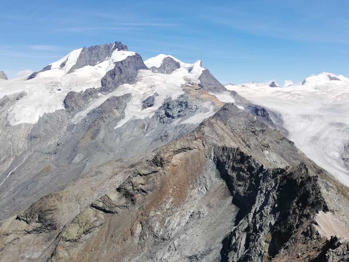 Auf den Bildern sind auch die traurigen Schnee-/Firnverhältnisse in den Walliser Alpen gut zu erkennen. Der Neuschnee vom letzten Freitag ist praktisch überall in den Felsen wieder weg.