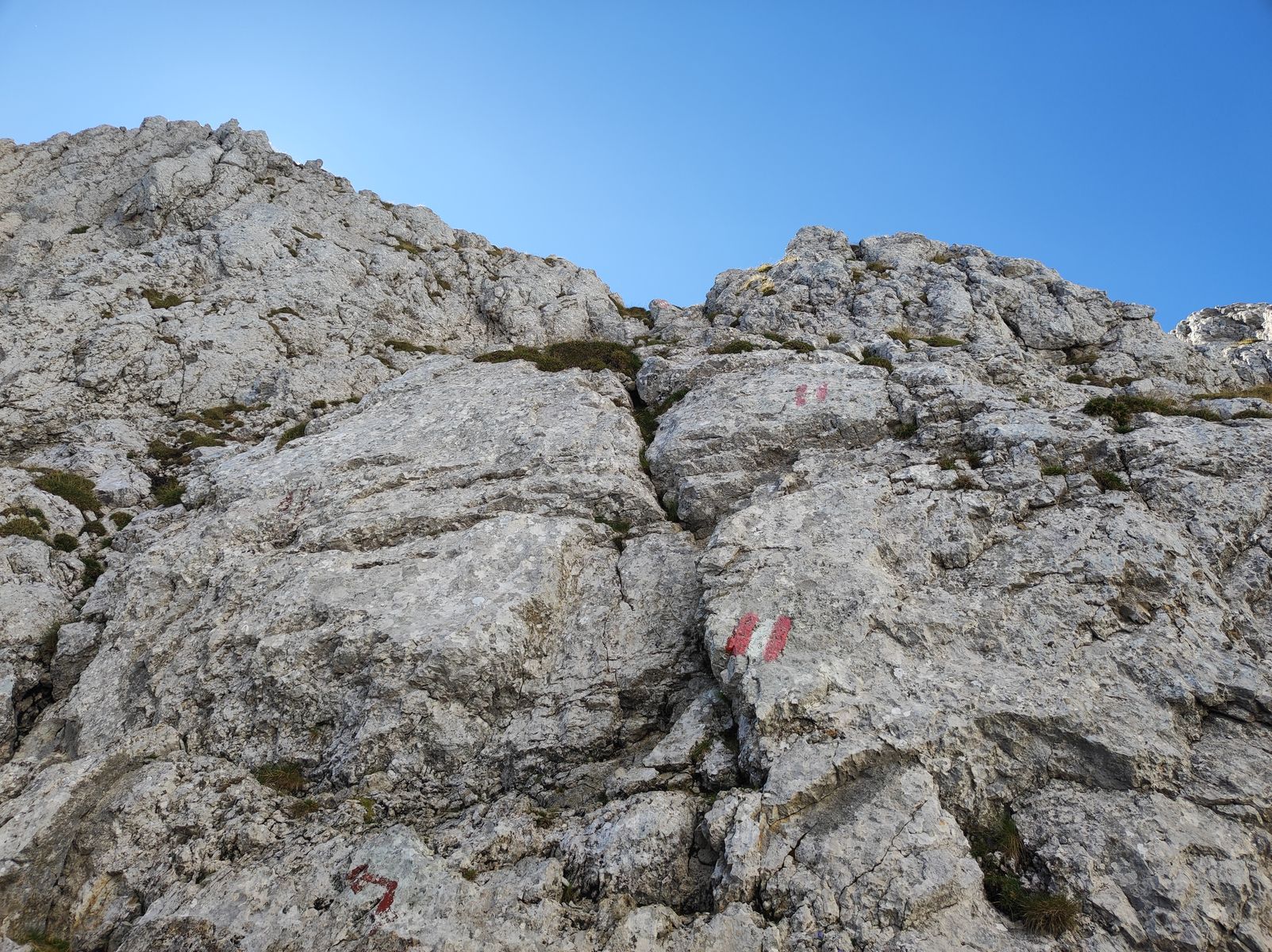 Anforderungen: in den Gipfelbereichen und rund ums Kleine Törl T5 mit Ier-Stellen, sonst leichter. Nach der letzten Scharte vor der Regalmwand gibt es kurzes, wenig aufgesetztes IIer-Wandl, das aber unproblematisch ist, sofern man den richtigen Griff findet (Tipp: mit der linken Hand hochlangen). Der Weg zur Pflaum Hütte durch das Große Griesener Kar ist nebenbei bemerkt deutlich angenehmer als der durch das sehr ruppige Kleine.