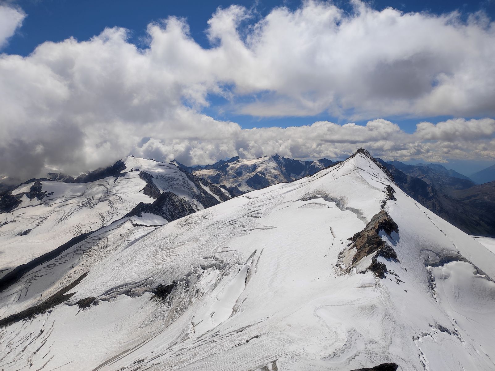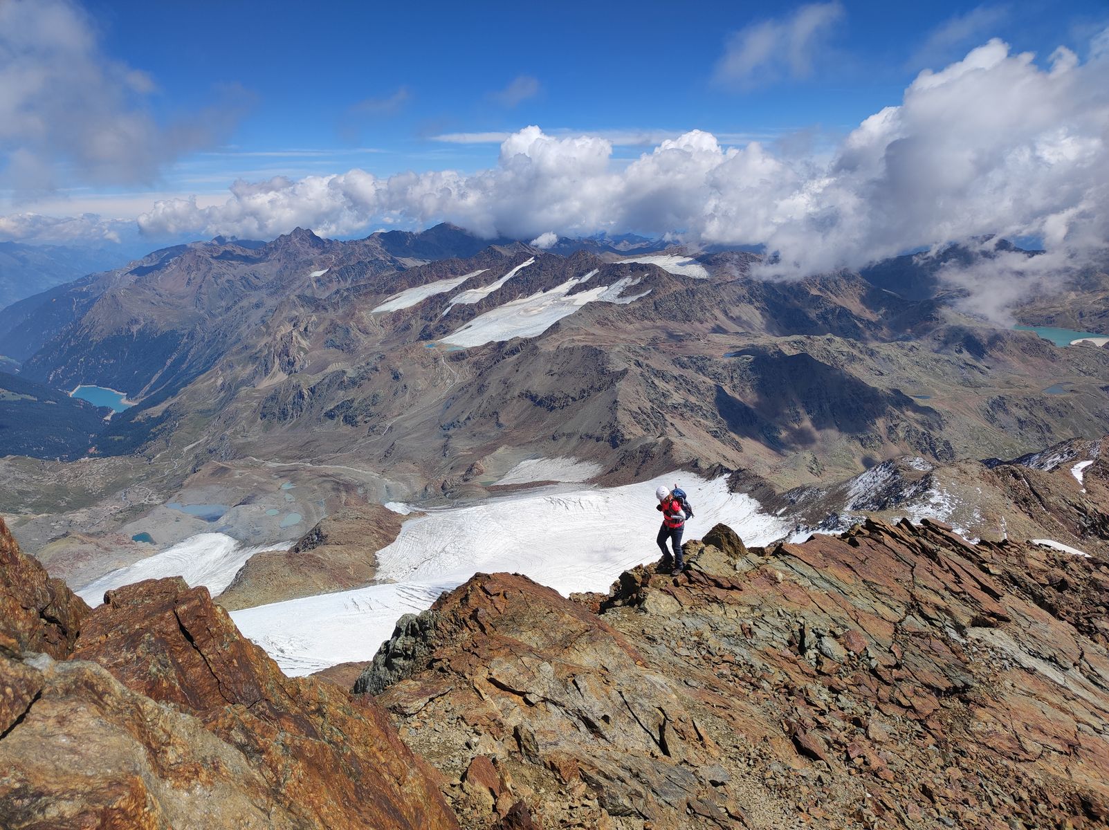 Den Übergang zum Cevedale haben wir nicht gemacht. Uns wurde beim Aufstieg berichtet, diese Route oder der Cevedale generell seien zurzeit gesperrt (ich hab deswegen meine Eis Ausrüstung am Beginn des Grates deponiert). Vom Gipfel aus sah der Übergang aber nicht unmöglich aus und auch der Normalweg von der Casati-Hütte war gespurt. Dennoch ist der Cevedale weit entfernt von guten Bedingungen! Man lasse sich von meinen Bildern nicht täuschen: Der Gletscher ist weitgehend aper und weiß schaut er nur aus, weil es in der letzten Nacht zwei Zentimeter Neuschnee gab... Für eine Besteigung des Cevedale wird man in meinen Augen am steilen Gipfelhang mit Eisschrauben sichern müssen (und schauen, wie und ob man über die große Spalte kommt).
