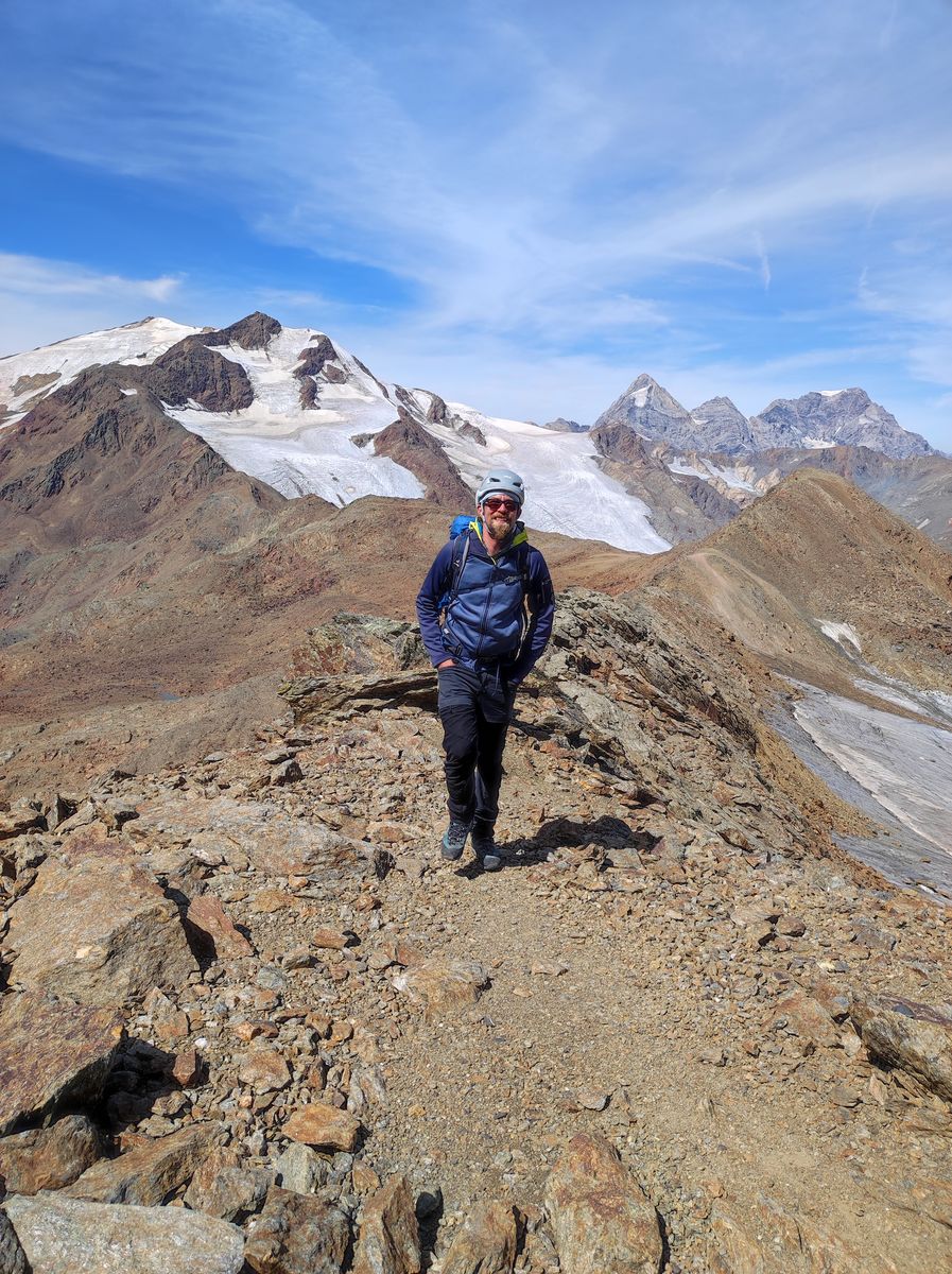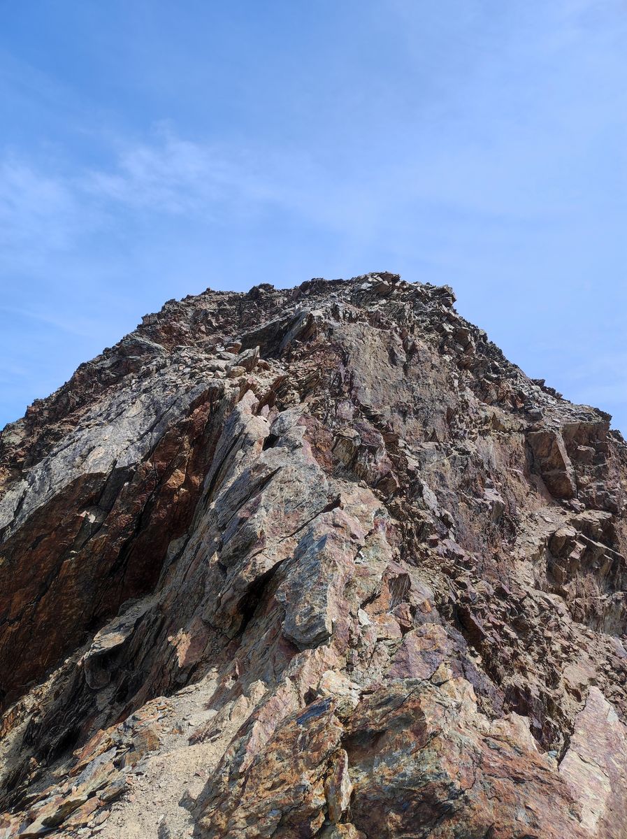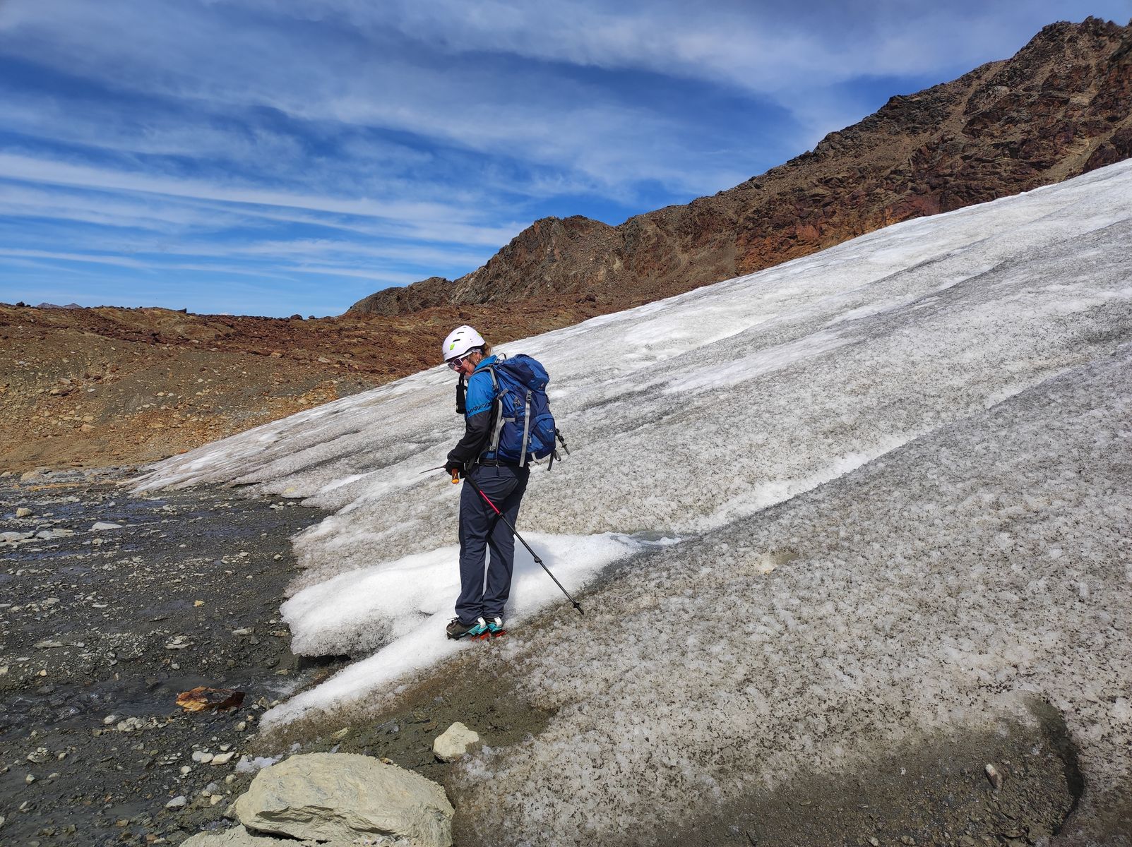 Zum "Drüberstreuen" haben wir anschließend noch die Rotspitze mitgenommen. Vom Gletscherende dazu nicht nach links ins Tal absteigen, sondern weglos (aber steinmandl-markiert) ohne großen Höhenverlust zum Normalweg auf die Rotspitze. Das Gestein weist übrigens tatsächlich verschiedene knallige Rottöne auf.