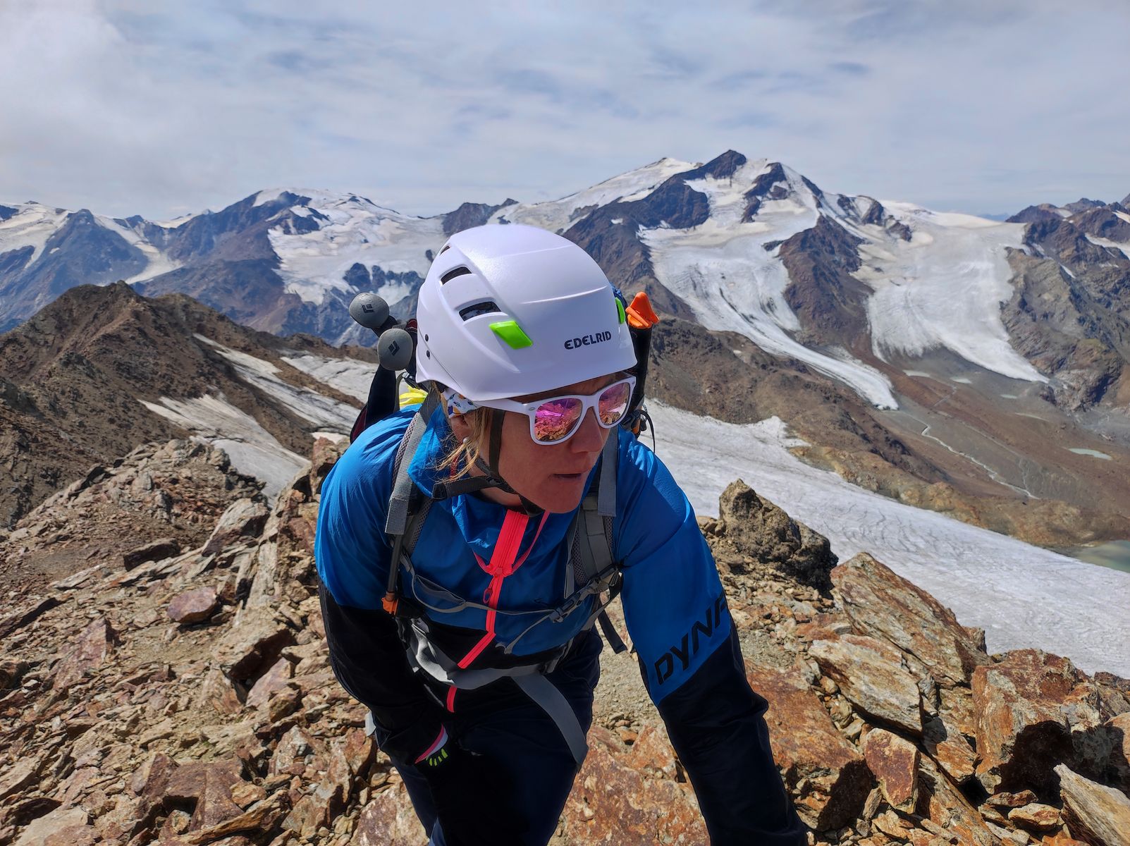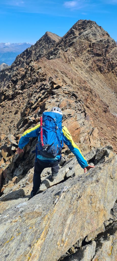 Nun der Beschilderung zur Köllkuppe (= Cima Marmotta) folgend, gelangten wir bald zum Hochferner (flach, aper und spaltenlos - zumindest im Bereich des Aufstiegs zur Köllkuppe). An geeigneter Stelle geht es auf den Grat und unschwierig zum Gipfel. Der Übergang zur Veneziaspitze I bildet das Kernstück der Tour und beinhaltet die Schlüsselstelle: Zunächst geht es zwar oft ausgesetzt, aber nie wirklich schwierig am Grat entlang. Erst am letzten Aufschwung zur Veneziaspitze wird es moralisch recht happig: Zunächst geht es an wild geborstenen Felsen (Hält das wirklich?)hangelnd über einen veritablen Abgrund (II) und es folgt ein kleiner, griffarmer Überhang, der mittles einer Trittschlinge Marke Eigenbau (danke unbekannterweise) überwunden wird. Diese Stelle ist für Leute, die wie Claudia kleiner als 1,70m sind, deutlich schwieriger als für jemanden wie mich (1,83). Während ich mich gut mit den Beinen verspreizen konnte und die Griffe problemlos erreicht habe, haben bei Claudia einfach ein paar Zentimeter gefehlt; sie ist aber natürlich trotzdem hochgekommen. Ohne die Schlinge glatt IV.