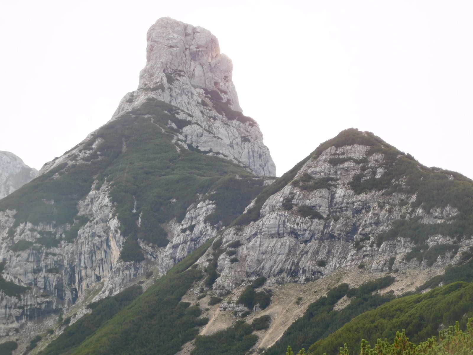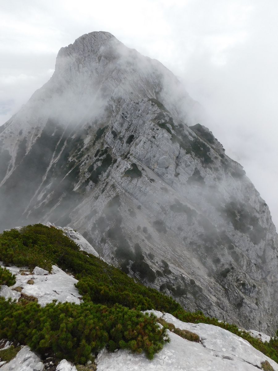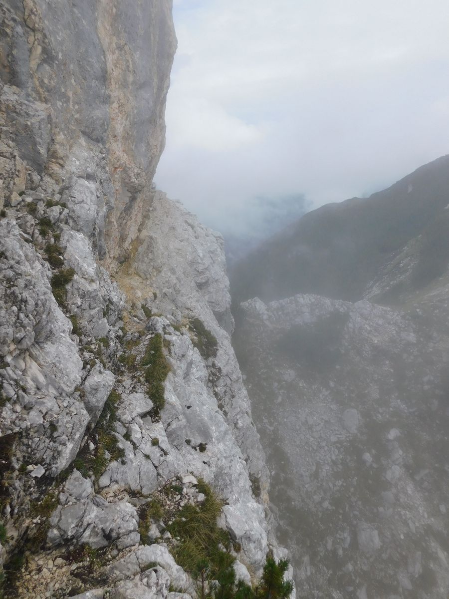 - Nach dem "bösen Band" wird man von den Steinmanndl eher in die Nordflanke geleitet, aber man sollte lieber so bald wie möglich zum Grat hoch - ansonsten muss man später im brösligen Gelände zum Grat hochkraxeln. Vielleicht kann man auch noch weiter in der Nordflanke ausholen und kommt dann viel später auf den Grat - aber dann verpasst man schöne Grat-Passagen