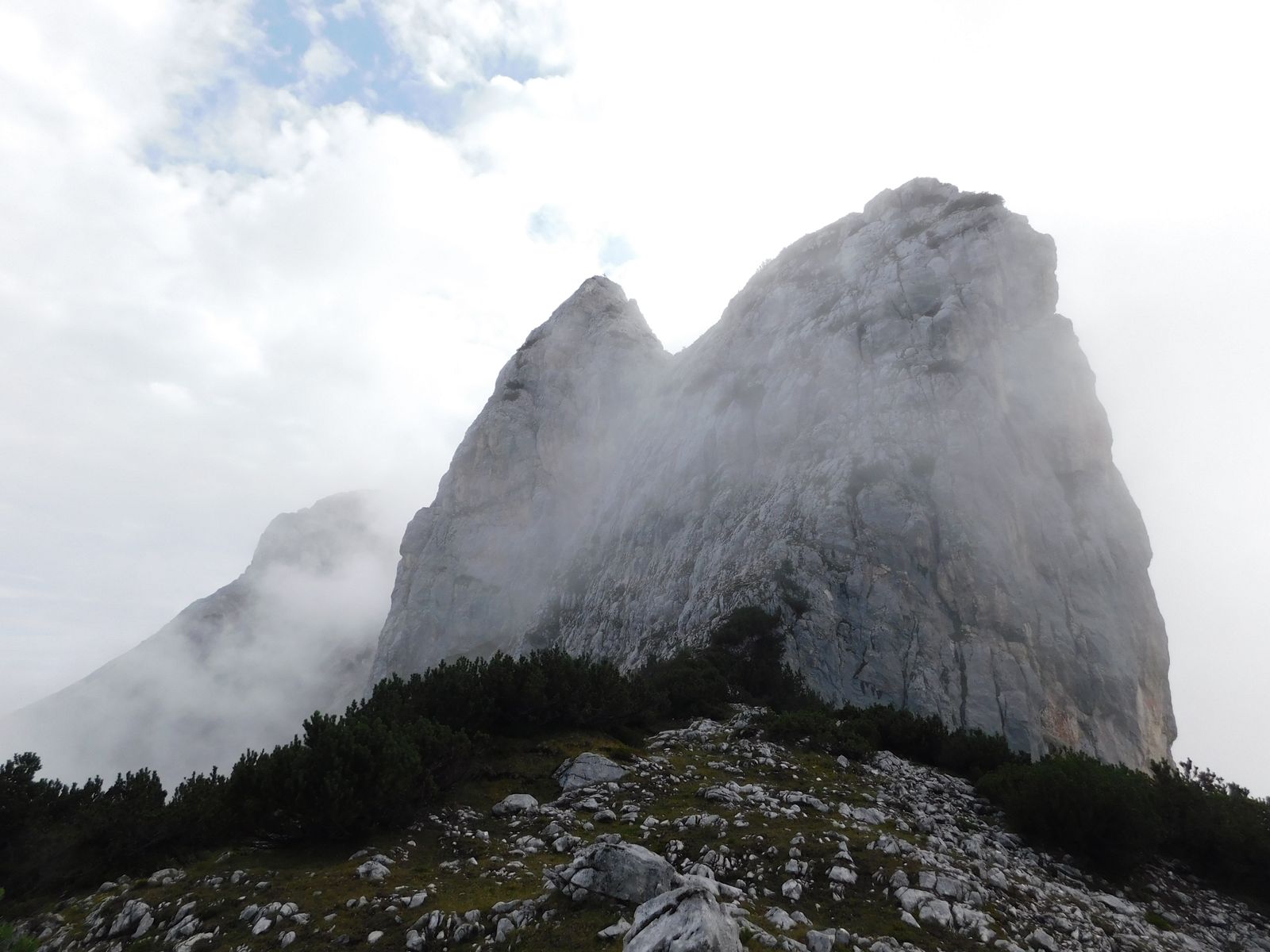 Ich wollte versuchen, zwischen den zwei vorausgesagten Regenphasen die Arnspitzen-Überschreitung hinzubekommen. Nachdem es bis zum Zwirchkopf noch leicht genieselt hat, hab ich mich schon darauf eingestellt, wahrscheinlich bei der Arnplattenspitze umdrehen zu müssen. Aber es wurde dann besser als gedacht! Ich hab öfters zum Himmel und auf das Niederschlags-Programm geschaut - und dann entschieden weiterzugehen. Der Fels war an den meisten Stellen wieder getrocknet, sonst wär ich die Arnplattenspitze nicht abgeklettert.