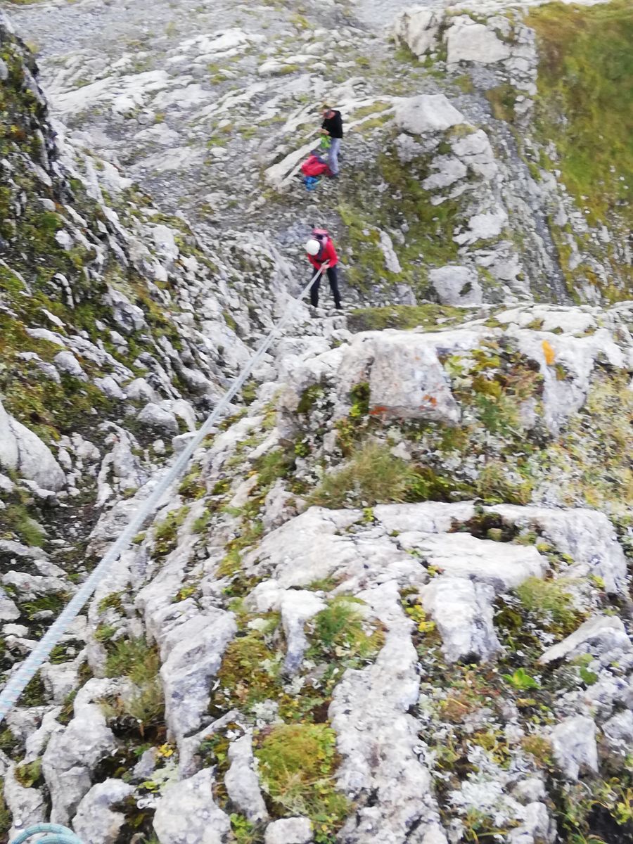 Dann 2x abseilen durch eine kaminartige Rinne, an deren Ende leicht rechtshaltend zu drittem Abseilhaken und hier eher links haltend zu einer vierten Abseilstelle am oberen Beginn einer sehr steilen schrofigen Rinne und durch diese runter.