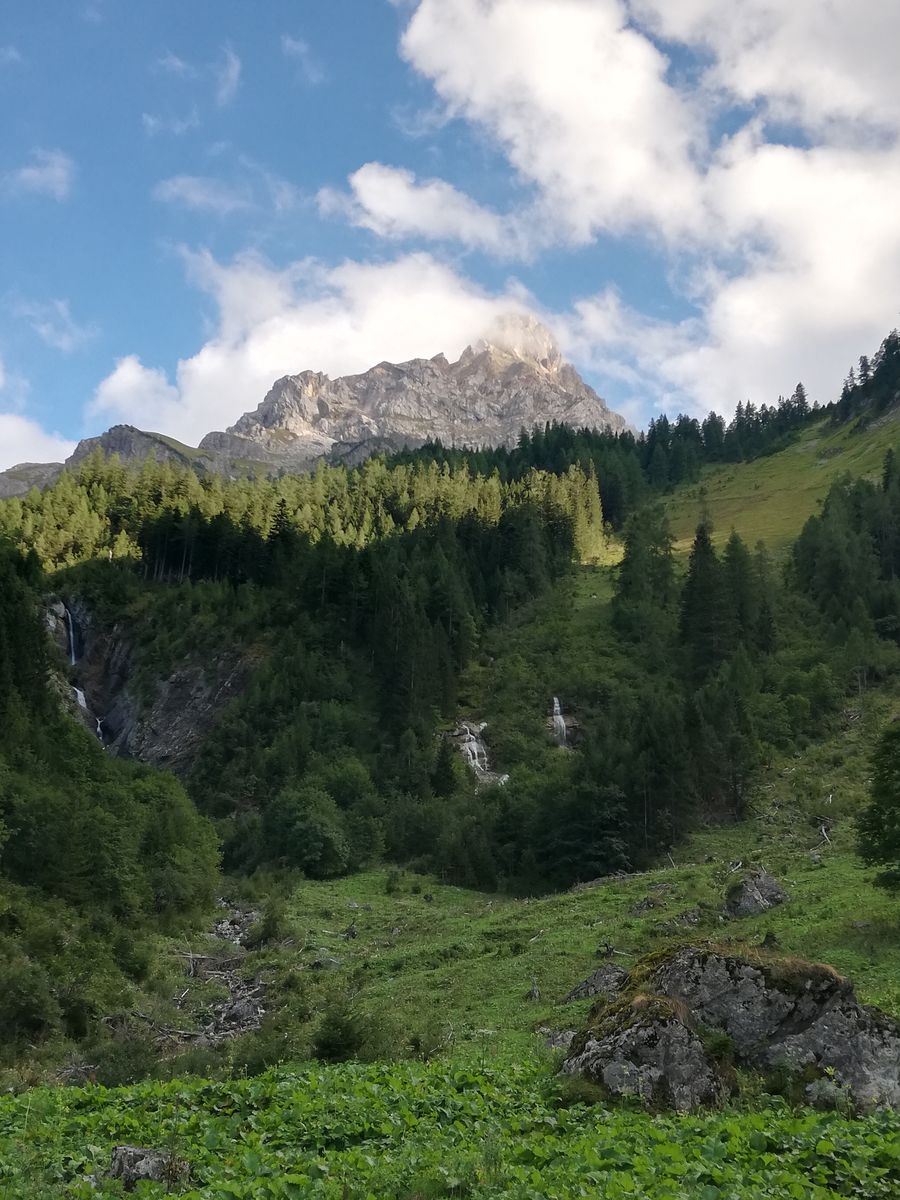 Am Samstag von Brand auf die Sarotlahütte. Dazu muss man an einem Golfplatz vorbei erstmal talauswärts und leicht bergab laufen, ehe man in das Sarotlatal abbiegt und meist durch Wald bis zur Hütte auf 1600m aufsteigt. Und weil es doch nicht bzw. nur wenige Minuten regnete, am Nachmittag noch auf den Großen Valkastiel. Dazu geht man auf markiertem, zeitweise recht steilem Weg von der Hütte bis ganz kurz vor das Eiserne Törle und dann auf einem Steig durch Schutt, die letzten knapp 50Hm eher unangenehm auf Steigspuren zum Gipfel, von dem ich bis dahin noch nie gehört hatte. Auf gleichem Weg zurück. Viele Wolken, wenig Sicht, aber kein Regen oder gar Gewitter.