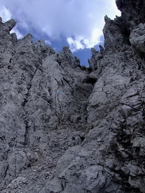 Pfeiser Spitze - Thaurer Jochspitze: der Abstieg von der Pfeiser Spitze hinunter ins Geröllkar hat durchgehend den Charakter eines leichten KS: vom Gipfel zunächst recht luftig entlang einer Felskante, dann wird man durch ein System von bröseligen Rinnen "hinuntergefädelt" ins grosse Geröllkar.