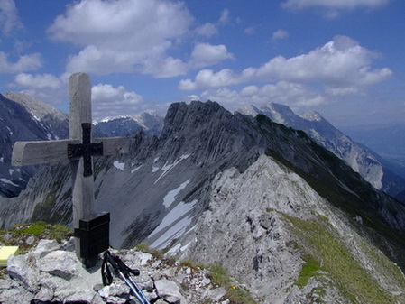 Im Geröllkar angekommen könnte man auf gut erkennbaren Steigspuren gleich hinüberqueren zum Stempeljoch; wer noch Lust + Zeit hat, sollte linkerhand in wenigen Minuten wieder zum Kamm hinaufsteigen (Geröll, Steigspuren) und auf schmalem Steiglein hinübergehen zur hübschen Thaurer Jochspitze (ca. 40 Min. hin und retour)
