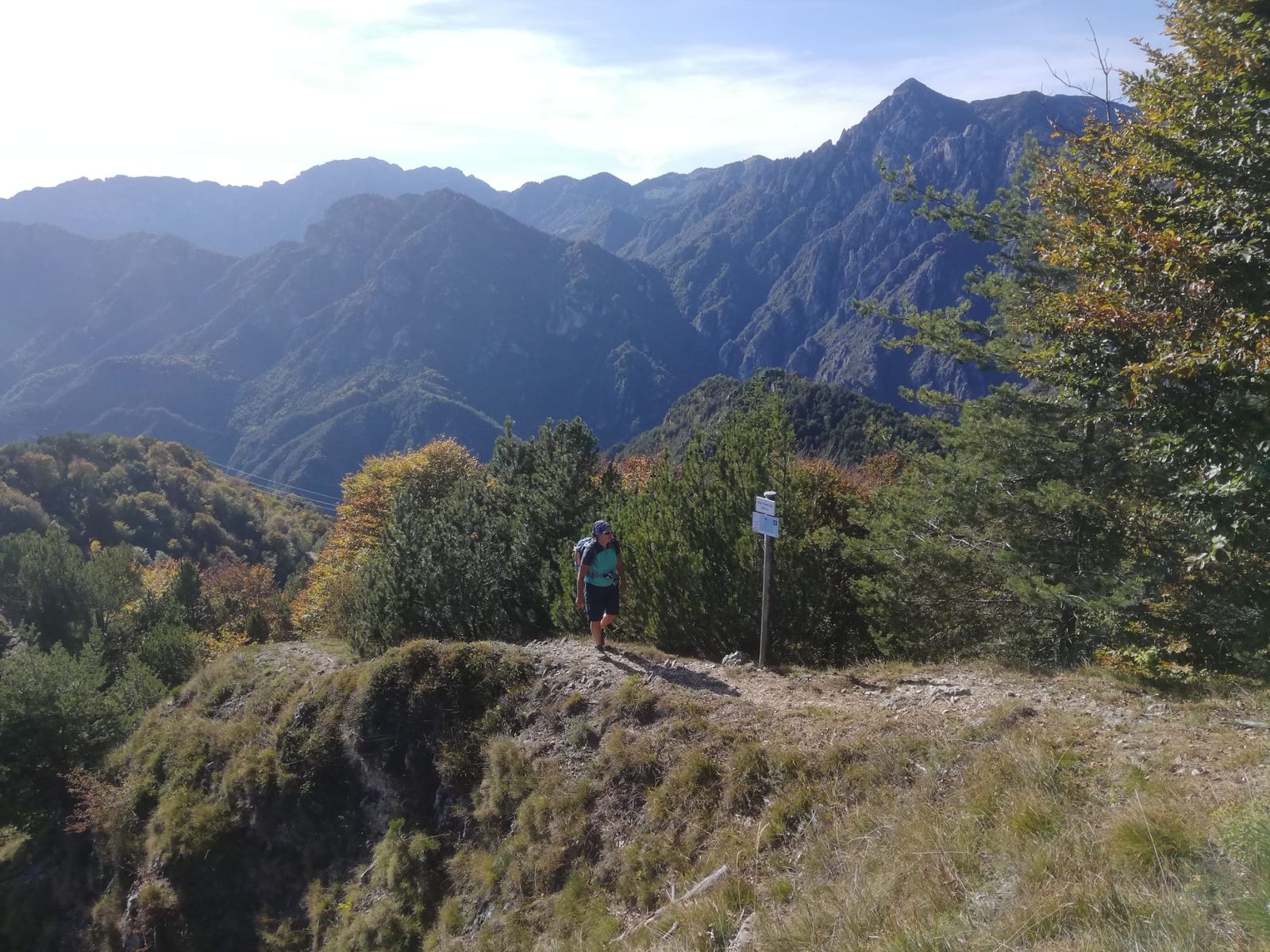 Heute zunächst mit dem Rad die "Jedermannstour" durchs Val di Bondo auf Teersträßchen (das auch Autos befahren dürfen) zum Passo Nota (9km). Das dortige Rifugio hat nach Auskunft des Hüttenwartes noch bis 31.10. geöffnet, täglich bis 18.00 Uhr. Anschließend auf der Militärstraße der Corna Vecchia entlang, bis ein Wegweiser den bzw einen Pfad zum Monte Traversole weist (ein Stück vor dem ersten Tunnel). Auf dem Pfad in wenigen Minuten auf einen Sattel, nach links abbiegen, an einer Holzhütte (die auch schon von der Straße aus sichtbar direkt auf dem Grat steht) vorbei immer das Steiglein weiter. Ein steiler Zwischenabstieg ist dabei, zum Schluß steil zum Gipfel.