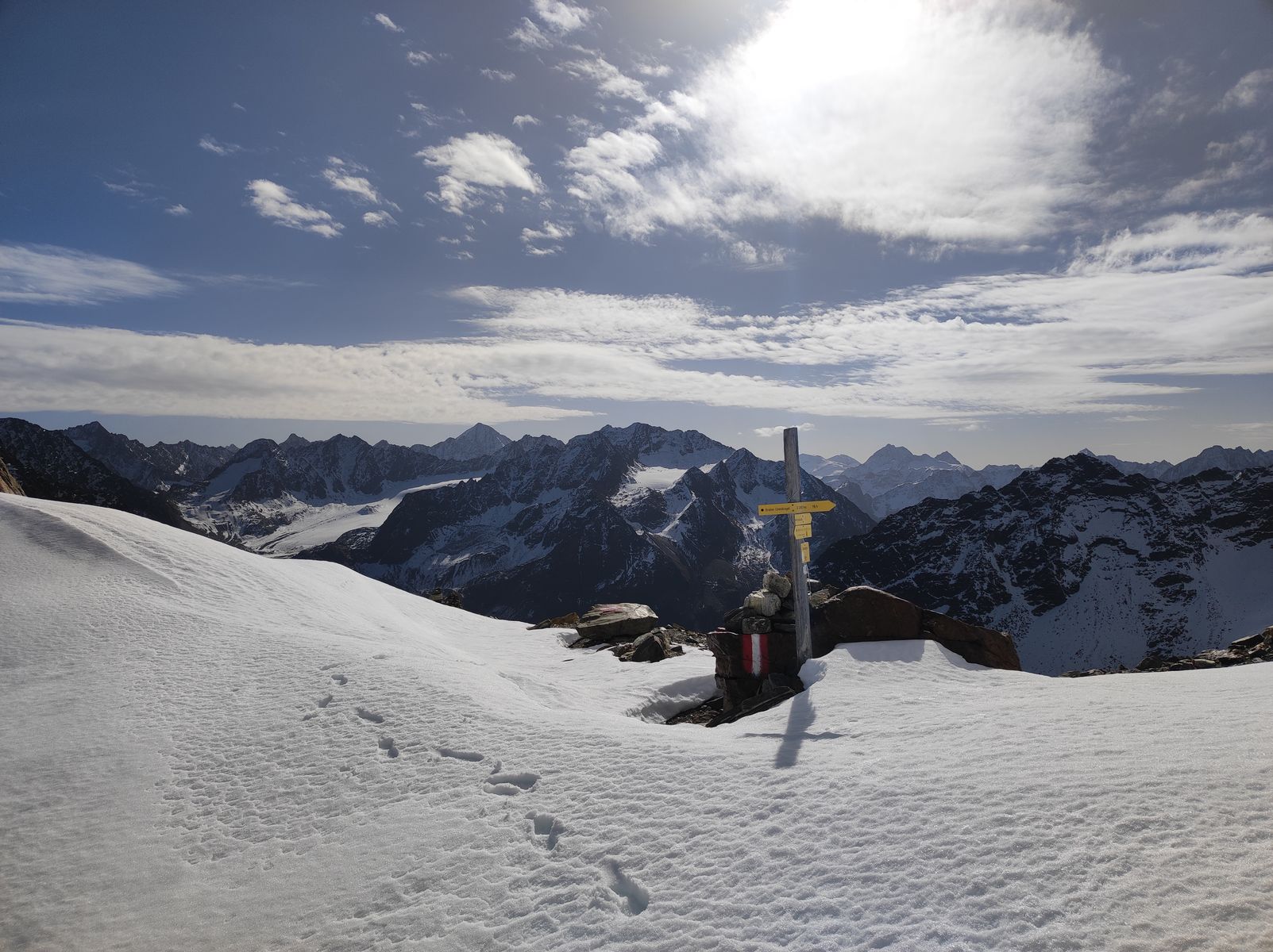 Hinweis zum Abstieg vom Zwieselbachjoch: Das Schild am Joch weist geradeaus hinunter, aber der Weg verläuft von oben gesehen zunächst höhengleich in der linken Flanke (Markierungen teils unter dem Schnee). Steigt man gerade hinunter, gerät man in ungutes Gelände, da hier noch letzte Reste des Zwieselbachferners in Form von Eisblöcken liegen - da kann man bei der momentanen Schneelage schnell mal in ein Loch plumpsen.