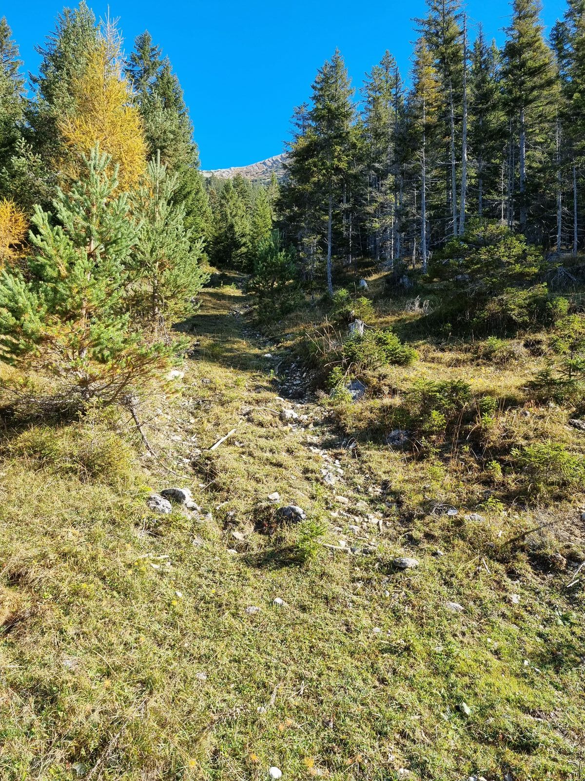 Den richtigen Einstieg zu finden, ist nun nicht ganz einfach. In einem Tourenbericht habe ich gelesen, man sollte direkt nach dem Bluetsgraben in den Wald einsteigen und sich immer an dessen rechten Rand nach oben arbeiten. Und tatsächlich ziehen direkt vom Forstweg Steigspuren steil in den Bergwald. Wir sind jedoch noch ein paar Minuten weiter gelaufen, da in der Open Street Map an anderer Stelle ein Pfad eingezeichnet ist. Diesen konnten wir nicht ausmachen, aber da wo sich der Pfad befinden sollte, sind wir einer deutlich sichtbaren Schneise gefolgt, die vermutlich durch Forstarbeiten entstanden sind (siehe Foto 1).