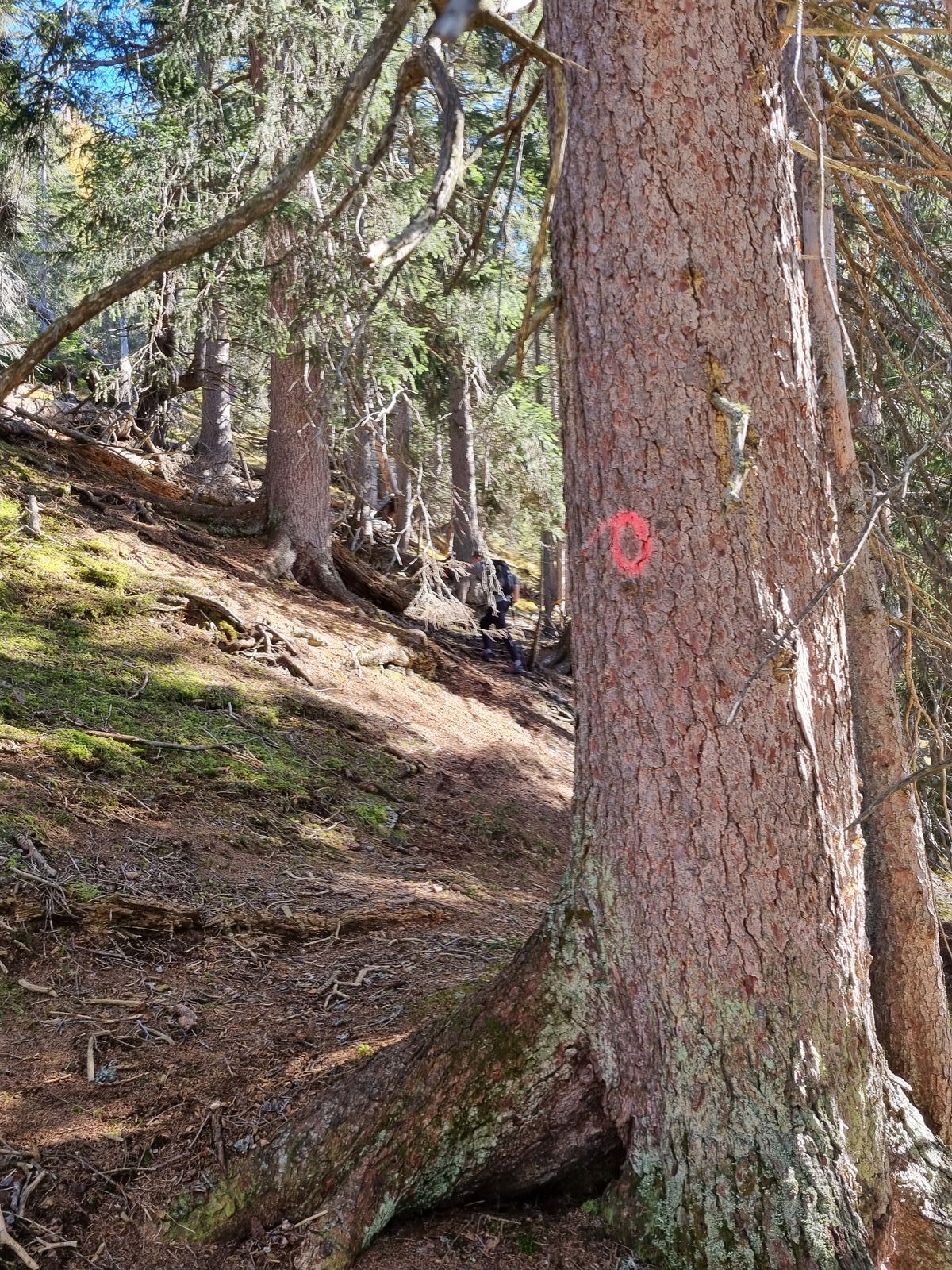 In Folge haben wir mit GPS versucht, dem Open Street Pfad zu folgen und teilweise ist ein solcher schwach erkennbar, aber man verliert ihn des öfteren. Das ist nicht weiter schlimm, die Richtung ist klar und man kann sich wenn auch etwas unbequem durch den Wald nach oben arbeiten. Am oberen Ende des Bluetsgraben auf ca. 1600 m stößt man dann auf erste Markierungen (siehe Foto 2). Ab da gibt es keine Schwierigkeiten mehr. Die Neon-Markierungen führen aus dem Wald in freieres Latschengelände. Außerdem ist eine deutliche Wegspur erkennbar.