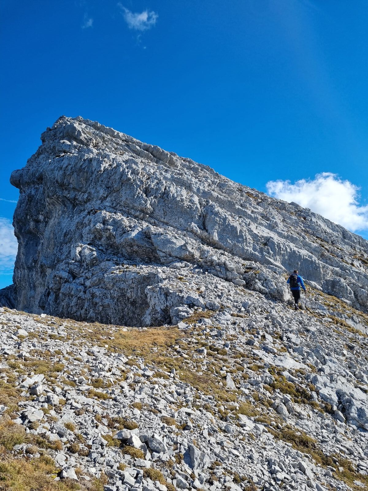 Hat man den Grat unterhalb des "Schönen Flecks" erreicht, eröffnet sich erstmalig der fantastische Blick auf den Karwendel-Hauptkamm (siehe Foto 5), der einen den restlichen Aufstieg auch nicht mehr verlässt. Man folgt nun logisch dem Grat meistens nahe der Kante. Sobald man dem Gipfel näher kommt, sind einige Felsriegel zu überwinden (siehe Foto 7). Ich denke man könnte die meisten direkt ersteigen, aber oft bietet sich rechts eine Umgehung an. Nur einmal muss zwingend geklettert werden, eine kurze I+