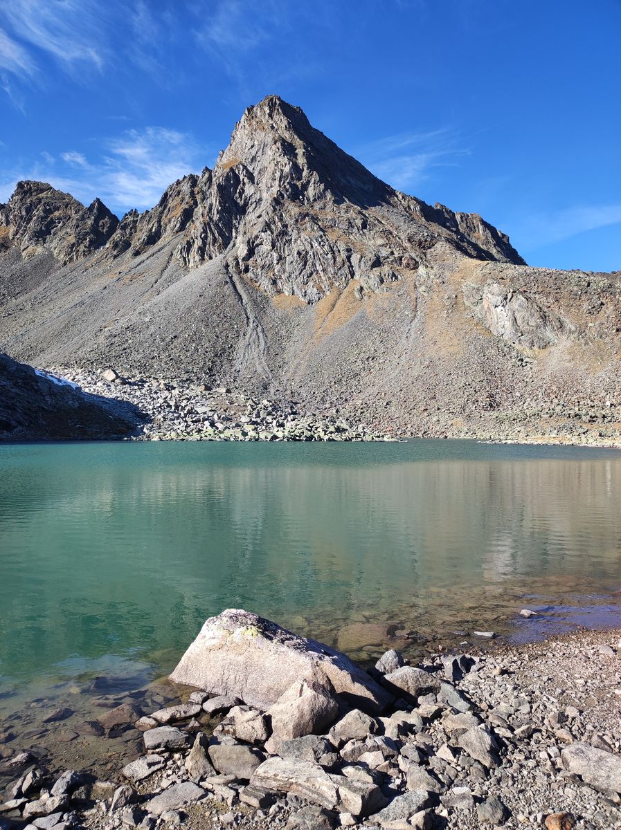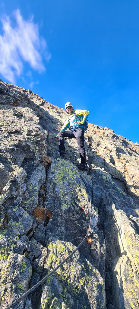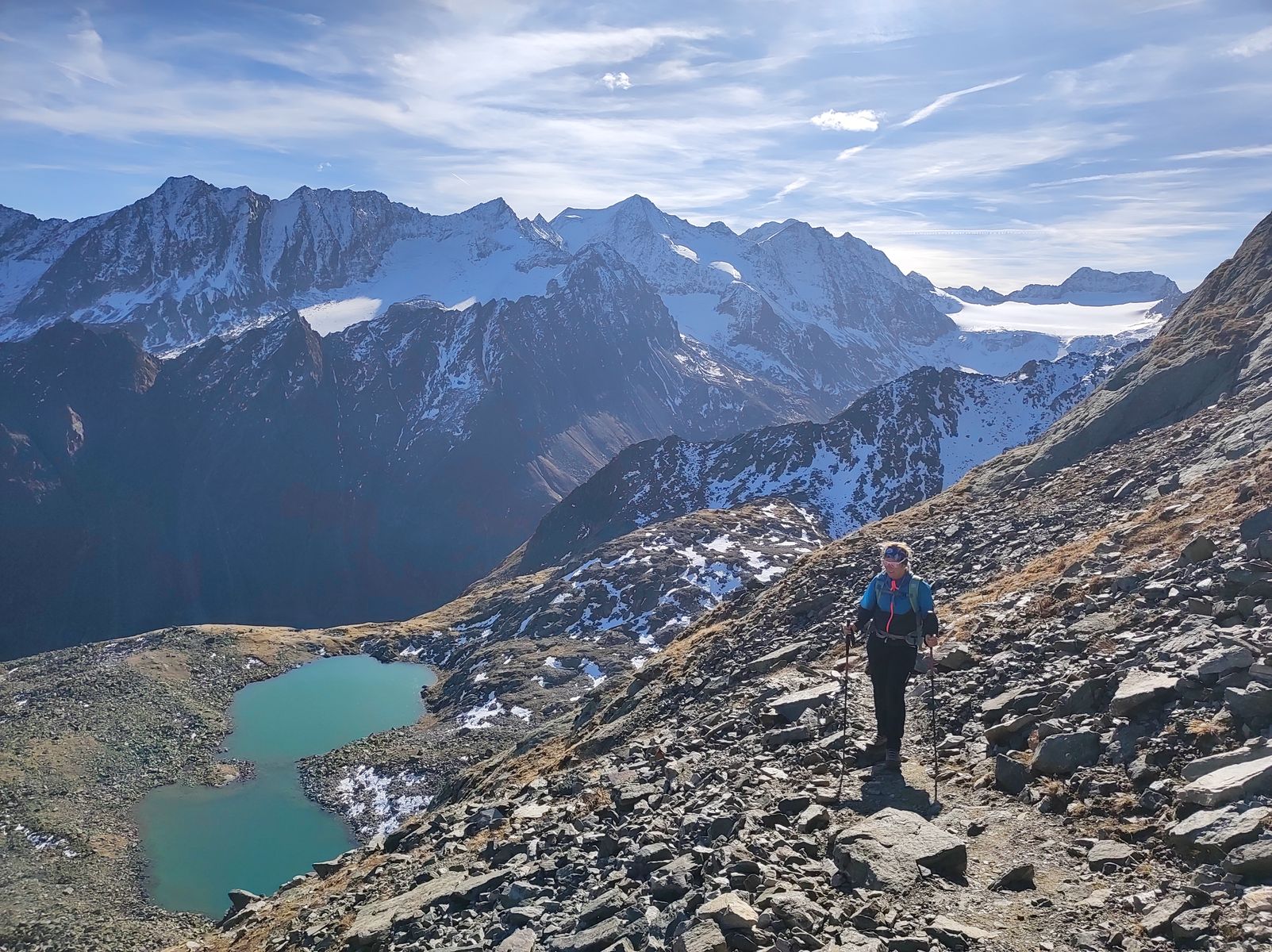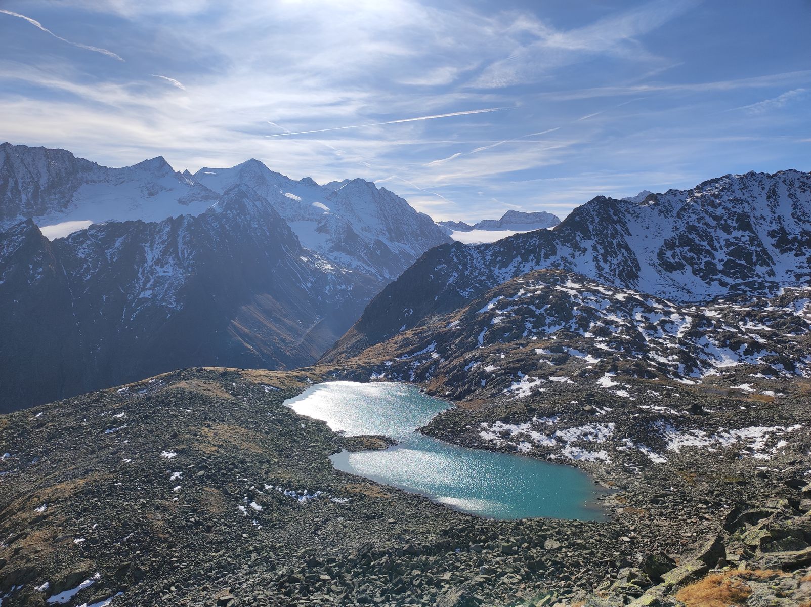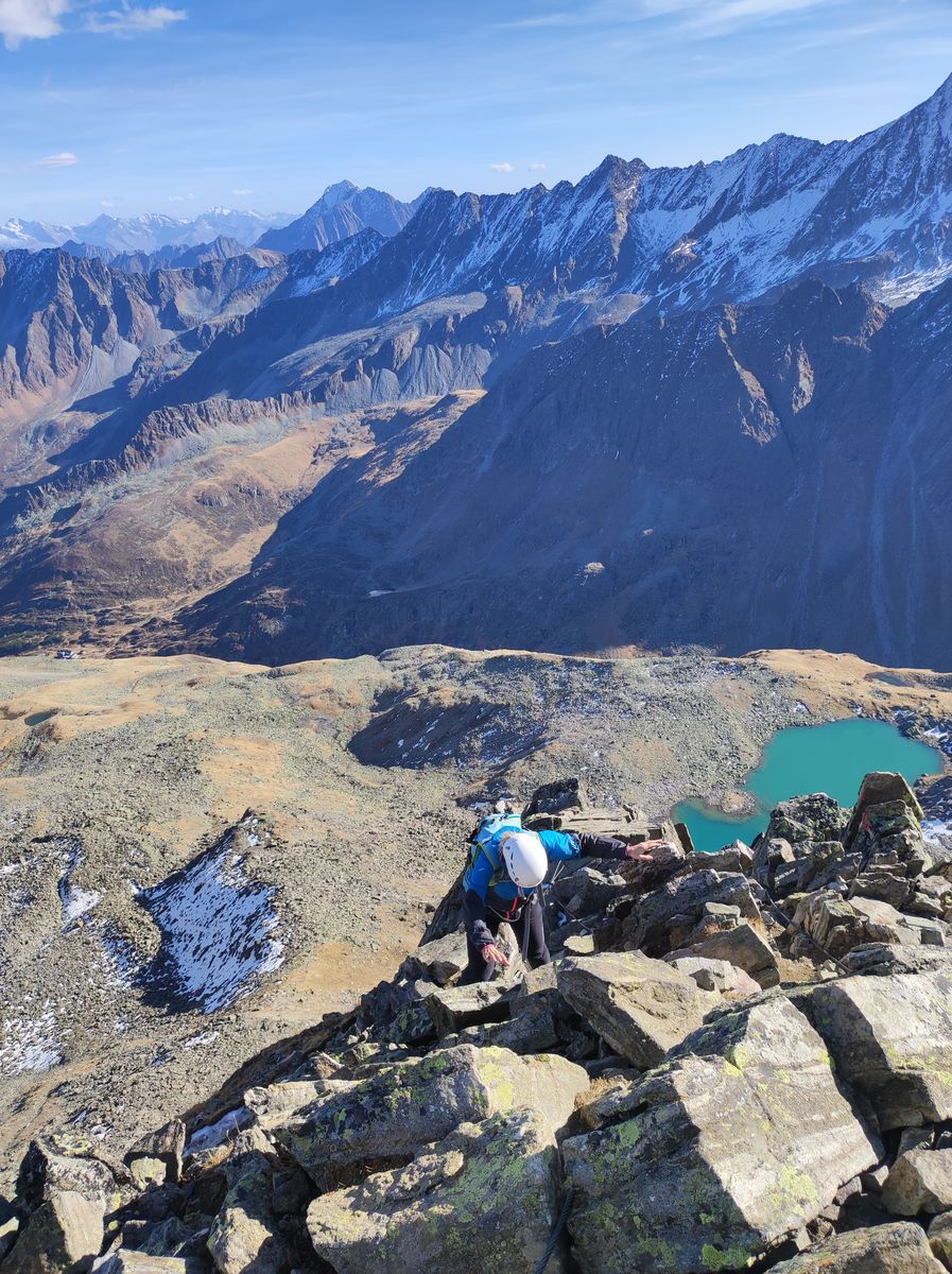 Wir sind gestern über die Franz Senn Hütte auf dem üblichen, gut ausgeschilderten Weg auf die Rinnenspitze und im Abstieg noch zum gleichnamigen See. Die Verhältnisse sind fast perfekt: Aufgrund der südseitigen Exposition bis zum Grat schneefrei. Nur wo man kurz auf die Nordseite wechselt noch etwas hartgefrorener Schnee, der sich aber auch ohne Grödel in meinen Augen unproblematisch begehen lässt. Die versicherte KS-Passage vor dem Gipfel werden Geübte ohne KS-Set begehen.