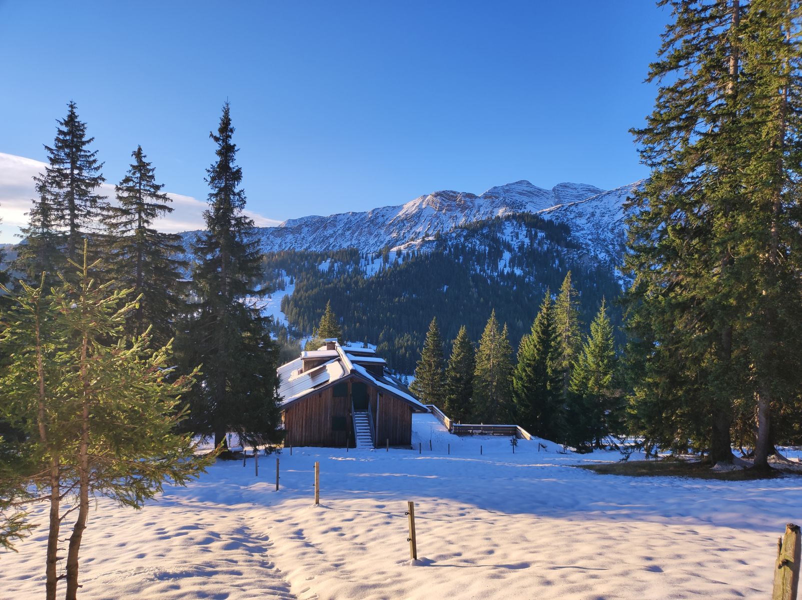 Am Montag haben wir vor dem Abstieg noch die kleine Runde zum aussichtsreichen Abendstein gemacht. Erst wollten wir zum Schneidjoch, doch da war der Weg unter dem Schnee zu sumpfig - meine Freundin ist einmal fast knietief in den Morast gestiegen - sodass wir es mit dem Abendstein bewenden ließen. Der Rückweg erfolgte über das Steinerne Kreuz und die Lange Au.