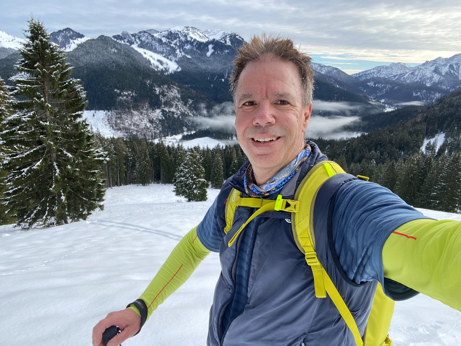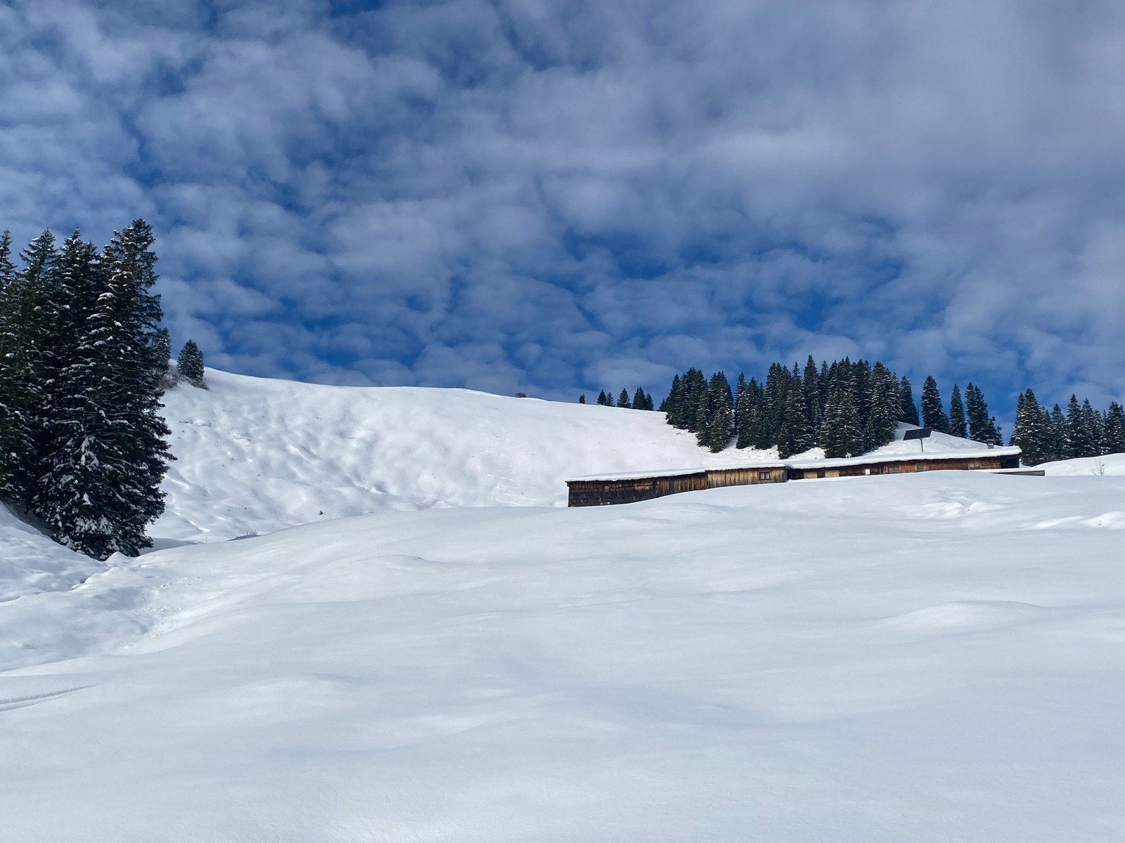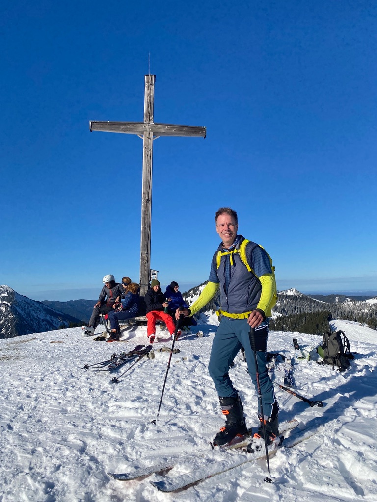 Also, Felle drauf und los. Ich drehte meine übliche Runde: über die Dreitannenroute in den Firstalmkessel und von hinten auf den Stümpfling, dann die erste Abfahrt - den herrlich pulvrigen Osthang hinunter, weiter auf der unten unangenehm harschigen Stümpflingabfahrt Richtung Valepp bis Höhe Albert-Link-Hütte, dann der zweite Aufstieg über die Grünseeroute, bei der richtiges Skitouren-Ambiente herrscht (keine Liftanlagen und Schneekanonen). An den Almen beim Grünsee habe ich mal die Schneehöhe gemessen, 60 cm.