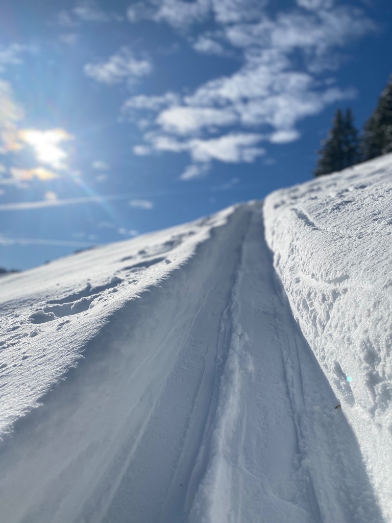 Ab 1200 m Pulverschnee, der nach oben immer besser wird. Nach dem Gipfelradler am Roßkopf Abfahrt über den Nordhang und weiter zum Kurvenlift.