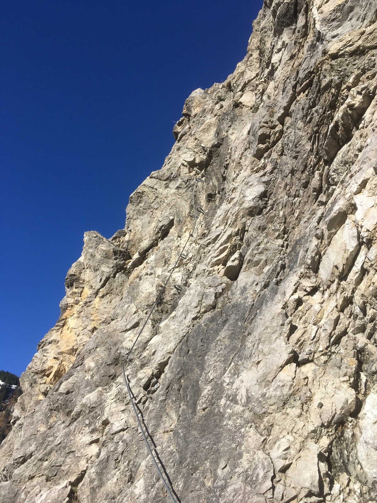 Eine der steileren Stellen des eher leichten (aber etwas splittrigen und rutschigen) Klettersteigs: